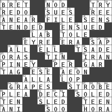ACROSS 1. Cy Young winner Saberhagen 5. Lower and raise head in agreement 8. Attempt 11. Make new 12. Takes to court 14. To riddle 15. Approach 17. Do some clerical work 18. Elected reps. 19. Looked after 21. Took place subsequently 23. Experiment locale 25. Lacquered or enameled metalware 26. Jane of fiction 27. Period 28. Plant excrement 31. 100% 33. Pipe bend 35. Sadhe (variant) 37. Mouths or openings 38. Metal container 40. SW Asia republic 41. Abounding in pines 43. For each 45. Slender fish 46. Label 47. Compass dir. 50. Period of immesurable duration 52. Silent film actress Nazimova 53. Chop off 54. Wine fruits 56. Disco prop 61. Entreaty 62. Tenth: prefix 65. Having a sole or soles 66. Nine, plus one 67. Downhill vehicle 68. Adolescent 69. Cuckoo 70. "Barney Miller" actor Jack 71. Israeli folk dance DOWN 1. Naughty child 2. French philosopher Descartes 3. Locale of original sin 4. Frog relative 5. Science/research agcy. 6. Fr. "Yes" 7. Erase 8. Woody plant 9. Tear apart 10. Affirmative reply 13. Sir (Sp.) 16. Trust 18. Take to court 20. Have the gumption 22. Narrow board 24. Waist strap 26. Otherwise 28. "Two Mules for Sister ____" 29. The sixth month of the Jewish calendar 30. Animal enclosure 31. Roberta Peters solo 32. Long (Scottish) 34. Mouth edge 36. Omen 37. Choose 39. Be tempered by heat 42. Sharp bark 44. Vintage cars 48. Bobsleighs 49. Artist's stands 51. Chooses 52. Auto club (abbr.) 54. Small, secluded valley 55. Painter Guido (1575-1642) 57. Writer of Portnoy's Complaint (1969) 58. Margarine 59. Fermented drink made from hops 60. Pulitzer Prize-winning author Ferber 61. Parent Teacher Assoc. 63. Corporate head (abbr.) 64. Wedding promise