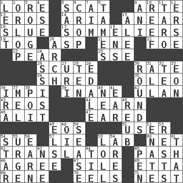 ACROSS 1. Old wives' tales, e.g. 5. Leave at once 9. Johnson of "Laugh-In" 13. Greek god of love 14. Operatic vocal solo 15. Approach 16. Turn sharply 17. Wine waiters 19. Coat; cloak 20. Viper 21. Compass dir. 22. Enemy 23. Lightbulb-shaped fruit 25. Compass dir. 26. Scutum 30. Assign a rank or rating to 34. Fragment 35. Margarine 36. Body of Kaffir warriors 39. Silly 42. ____ Bator 43. Vintage cars 44. Memorize 46. Came down and settled, as after flight 47. Having ears or earlike features 48. Greek goddess of the dawn 51. One who uses or employs something 54. Take to court 57. Untruth 58. Experiment locale 60. Remaining after all deductions 62. Interpreter 65. Romantic infatuation 66. Match 67. Drop; flow; fall 68. Singer James 69. French philosopher Descartes 70. Snakelike fish 71. Egg locale DOWN 1. For fear that 2. Fourth or lowest deck 3. Makeup applied to the cheeks 4. Compass dir. 5. Backtalk 6. Riding implement 7. Direct toward a target or goal 8. Makes less strong or intense 9. Black tropical American cuckoo 10. Coral ridge 11. Pacific island yam 12. Celtic language 15. Toward shelter 18. Followers of ems 20. Bowlike part 24. Aid 27. RI univ. 28. Nine, plus one 29. Peak District village in England 30. Periods in a boxing match 31. Everything 32. Afternoon social gathering 33. A really long time 36. Lyricist Gershwin 37. Cartoonist voice _ Blanc 38. Luau course 40. Teachers' org. 41. Ewer handle 45. Reuben's nickname 48. Otherwise 49. Lubricate 50. Gospel singer Marvin 52. Related on the mother's side 53. Musical pauses 54. Play the lead 55. Goad 56. Merit 58. Hang loosely or laxly 59. Ancient Greek god of war 61. Not this but _ 63. Born 64. Make a knot 65. Animal enclosure