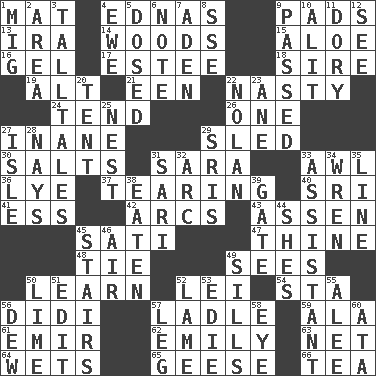 ACROSS 1. Floor covering 4. Ferber et al. 9. Groovy apts. 13. Retirement account (abbr.) 14. Forest 15. _ vera 16. Set 17. First name in cosmetics 18. Male parent of an animal 19. The first octave above the treble staff 21. Car or cant ending 22. Characterized by obscenity 24. Look after 26. Single 27. Empty; void 29. Downhill vehicle 30. Table seasonings 31. "Two Mules for Sister ____" 33. Leather borer 36. Sodium hydroxide 37. Pulling apart 40. _ Lanka 41. Double-curved letter 42. Curves 43. NE Netherlands city 45. Suttee (variant) 47. One or ones belonging to thee 48. Standoff 49. Perceives with the eye 50. Acquire or gain knowledge or skills 52. Luau accessory 54. R.R. building 56. "You Light Up My Life" star Conn 57. Dipping utensil 59. Chicken ___ king 61. Arab leader 62. Poet Dickinson 63. Remaining after all deductions 64. Moistens 65. Honkers 66. Beverage made from leaves DOWN 1. Russian fighter aircraft 2. Length times width 3. Baron Munchausen's specialties 4. She-sheep 5. Administered medicine 6. Observe 7. Arabian gulf 8. Compass dir. 9. Went by 10. Set down 11. Dinghy 12. Observe 20. Portable shelter 22. Pitcher Ryan 23. A saturated hydrocarbon 25. Egg locale 27. Small island 28. Negative votes 29. Indian titles of respect 31. Indian skirt 32. Curve 33. Helper 34. Songbird 35. Actor's bit 38. Eroded 39. Yard entry 44. "______ My Girl" (Turtles hit) 45. Flight of steps 46. Atmosphere 49. Beverly of Met fame 50. Citrus frut 51. Prepare for publication 52. Unable to walk 53. Singer Brickell 55. Toward shelter 56. Morning condensation 57. Part of a journey 58. Sight organ 60. "One Day ___ Time"