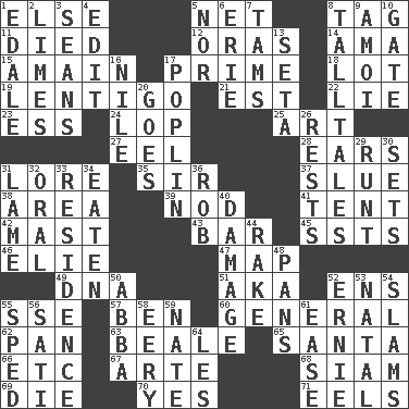 ACROSS 1. Otherwise 5. Fish or hair follower 8. Label 11. Passed on 12. Mouths or openings 14. Wet nurse (var.) 15. With great haste 17. A-one 18. Car dealer's back yard 19. Small, flat, pigmented spot on the skin 21. Eastern Standard Time (abbr.) 22. Whopper 23. Curvy letter 24. Trim (branches) 25. Nonscientific branch of learning 27. Snakelike fish 28. Hearing organs 31. Old wives' tales, e.g. 35. Title for a knight 37. Turn sharply 38. Length times width 39. Allow head to fall sleepily 41. Portable shelter 42. Vertical spar for supporting sails 43. Soap unit 45. Fast planes 46. Writer Wiesel 47. Atlas unit 49. Heredity factor (abbr.) 51. Alias (abbr.) 52. Followers of ems 55. Compass dir. 57. Benjamin's nick name 60. Commissioned military rank 62. Baking dish 63. Calif. Air Force Base 65. Before Barbara or Clara 66. And so on (abbr.) 67. Johnson of "Laugh-In" 68. Thailand, formerly 69. Pass on 70. Consenting reply 71. Snakelike fish DOWN 1. Peak District village in England 2. Citrus fruits 3. Actors Connery and Penn 4. Prepare for publication 5. And not 6. 4th largest of the Great Lakes 7. Scottish caps 8. Baron Munchausen's specialties 9. Mine, in Marseilles 10. Yard entry 13. Bristle 16. Mediterranean tributary 17. Cotton for raincoats, e.g. 20. Moves 26. Musical pauses 29. The smallest animal of a litter 30. Arranges properly for use 31. Unable to walk 32. Spoken 33. Dwelling 34. Eroded 36. Director Reiner 40. Break 44. Libertine 48. Baking dishes 50. Swedish rock group 52. Bert's buddy 53. Brizilian seaport 54. Shuts with force 55. Moved rapidly 56. Suttee (variant) 58. Suggestive of the supernatural 59. Nathan's nickname 61. Comfort 64. French article