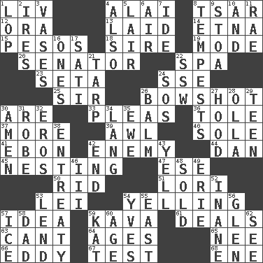 ACROSS 1. 54 in ancient Rome 4. Jai _ 8. Russian ruler of old 12. Mouth or opening 13. Put down 14. Inactive volcano in Sicily 15. Mexican monetary units 18. Father 19. Method 20. Legislator 22. Health resort 23. Bristle 24. Compass dir. 25. Title for a knight 26. The distance a bow sends an arrow 30. "We ___ not amused" (Victoria) 33. Entreaties 36. Lacquered or enameled metalware 37. Greater amount 39. Leather borer 40. Not divided or shared with others 41. Inky black, to poets 42. Foe 44. One of the 12 tribes of Israel 45. Nestling 47. Compass dir. 50. To free from 51. Australian parrot (variant) 53. Luau accessory 54. Crying or shouting loudly 57. The content of cognition 59. Polynesian shrub of the pepper family 61. Allots cards 63. Patter 64. Matures 65. Born 66. Whirlpool 67. Trial 68. Compass dir. DOWN 1. Trim (branches) 2. Angers 3. Flower holders 4. In addition 5. Den 6. Atmosphere 7. Binary compound 8. Storms 9. Portico 10. Also 11. Actress Charlotte 16. Washington bills 17. Suttee (variant) 21. Canvas cover 22. Compass dir. 24. Distress signal 26. Lip ointment 27. Parka part 28. Rounded earthenware pot or jar 29. Adolescent 30. So be it 31. Loose flowing garment 32. Greek god of love 34. Austrian-born American filmmaker Fritz 35. She-sheep 38. Plea 42. Conclude 43. Shout 46. One more than two 48. Exchanged or delivered for money 49. 4th largest of the Great Lakes 52. Empty; void 53. Grant temporary use of 54. Jacques Cousteau's middle name 55. Compass direction 56. Small, secluded valley 57. Frozen water 58. June honoree 59. Krazy ___ of comics 60. Grow older 62. Observe