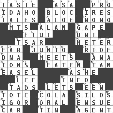 ACROSS 1. Clothes sense 6. White ___ sheet 9. Adept person 12. Potato state 13. Alliance 14. Angers 15. Stories 16. _ vera 17. Words to Nanette 18. Mountains (abbr.) 19. ____ Jay Lerner 20. Yawn 21. Needle holder 23. Single; one (prefix) 24. Russian ruler of old 25. Distance measurement 28. Hearing organ 30. Secret group 34. Travel on or in a vehicle 35. Heredity factor (abbr.) 36. Confronts 38. Santa ___, CA 39. Charged particles 41. Eroded 43. Scottish cap 44. Artist's stand 46. American tennis player Robert 48. Area sheltered from the wind 49. Information 50. Small amounts or degrees 51. Allows 53. Car or cant ending 56. Lug 57. Root beer relative 58. Grain storage towers 60. Composer Stravinsky 61. Taken by mouth 62. Follow as a consequence or result 63. Auto 64. Shallow baking pan 65. Rep DOWN 1. Teat (slang) 2. First of billions? 3. Table seasoning 4. College papers 5. Greek goddess of the dawn 6. Silent film actress Nazimova 7. Within a short period 8. Adept person 9. Appease 10. French philosopher Descartes 11. Bear (Spanish) 13. Indonesian resort city 14. More lacking in sense or substance 19. Gold (Symbol: Au) 20. Chewing product 22. _ Mahal 24. Interpreter 26. Pulitzer Prize-winning author Ferber 27. 480, 500 or 516 sheets of paper 28. Singer Brickell 29. Small Philippine buffalo 31. Born 32. Beverage made from leaves 33. Baseball player Mel 37. Seines 40. Sowing specialist 42. Science/research agcy. 45. French article 47. Weeding 49. Slanted text style (abbr.) 50. Ancient Roman robe 51. Australian parrot (variant) 52. Style 54. Otherwise 55. Part of speech 56. Nervous spasm 57. Small bed 58. Ocean 59. Put into a specified state