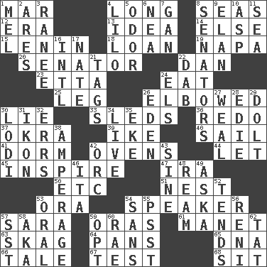 ACROSS 1. Make imperfect 4. Having great length 8. Oceans 12. Period 13. It may be bright or harebrained 14. Otherwise 15. Soviet premier 1918-24 18. Grant temporary use of 19. California wine valley 20. Elected representative 22. Daniel's nick name 23. Singer James 24. Consume 25. Part of a journey 26. Turned at an angle; bent 30. Untruth 33. Bobsleighs 36. Make new 37. Gumbo ingredient 39. Mamie's mate 40. Travel by water 41. Dormintory (informal) 42. Baking chambers 44. Allow 45. Stimulate to action 47. Lyricist Gershwin 50. And so on (abbr.) 51. A home for chicks 53. Mouth or opening 54. Orator 57. "Two Mules for Sister ____" 59. Mouths or openings 61. French painter Edouard 63. Heroin 64. Baking dishes 65. Heredity factor (abbr.) 66. Falsehood 67. Trial 68. Be seated DOWN 1. Cartoonist voice _ Blanc 2. Ancient Greek god of war 3. The wife of a rajah (variant) 4. _ and Stitch 5. Aroma 6. Teachers' org. 7. Separate the seeds from cotton 8. Elected representatives 9. Flair 10. Viper 11. Ocean 16. International (abbr.) 17. Nathan's nickname 21. Labels 22. Pat or tap gently 24. Raised railways 26. Locale of original sin 27. Welt 28. Singer Brickell 29. Stupid person 30. Farming town in central California 31. Picture 32. Blunders 34. Not recorded 35. Make supply last 38. Electrical Measurement 42. The grampus (Milton) 43. Trig term 46. Call ___ day 48. 480, 500 or 516 sheets of paper 49. "____ silly question..." 52. Looks after 53. Of the mouth 54. Without 55. Inconspicuous attention getter 56. Painter Guido (1575-1642) 57. Fast jet (abbr.) 58. Alias (abbr.) 59. Choose 60. Actress Charlotte 62. Make lace