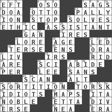 ACROSS 1. Newt 4. Bear (Spanish) 7. Settles 11. ___ good deed 12. "Beetle Bailey" pooch 13. Friendly 14. Electrically charged atom 15. Discontinue 16. Finds the solution 17. Moral principle 19. Aide 21. Separate the seeds from cotton 23. Angers 24. Old wives' tales, e.g. 25. Ripen 26. Directed 29. Laconic 30. Followers of ems 31. Mouth or opening 32. 54 in ancient Rome 33. Big collection agency 34. To free from 35. "We ___ not amused" (Victoria) 36. _-fi 37. Remain 40. For each 41. Area sheltered from the wind 42. Without 43. Skim 45. Keyboard modifier key 46. Determination 51. Cod relative 55. Foolish or stupid persons 56. Atlas contents 58. Call ___ day 59. Impressive in appearance 60. Singer James 61. HTML Container Element 62. Celtic language 63. Teachers' org. 64. Period DOWN 1. Singer Brickell 2. Pick up the tab 3. Hyperbolic tangent 4. Baseball player Mel 5. Portico 6. I made a mistake 7. Table seasonings 8. Inventor's middle name 9. Small, secluded valley 10. System (abbr.) 12. Motion picture awards 13. Airs 16. Male parents of animals 18. Composer Stravinsky 20. Signals 22. Born 24. Prying instrument 25. Nest on high 26. Domineers 27. 4th largest of the Great Lakes 28. June honoree 29. Hoop that covers a wheel 32. Infant locale 33. Ancient Celtic tribe of eastern Britain 36. Narrow boards 37. White ___ sheet 38. Greek mezzo-soprano Agnes 39. To the inside or interior of 43. Took without asking 44. Quote 46. Trig term 47. Scent 48. Teases 49. Sign of things to come 50. Nathan's nickname 52. Travel on or in a vehicle 53. Commotion 54. Polynesian shrub of the pepper family 57. Parent Teacher Association (abbr.)