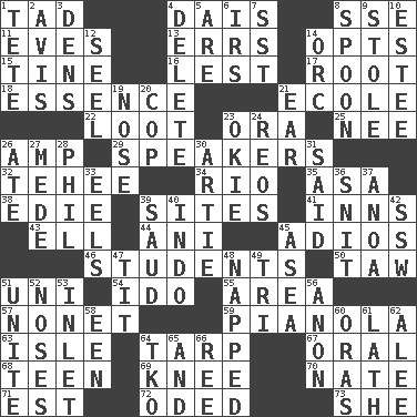 ACROSS 1. Small boy 4. Raised platform 8. Compass dir. 11. Nights before holidays 13. Blunders 14. Chooses 15. Prong on a fork 16. For fear that 17. Carrot, for example 18. Gist 21. Learning spot: Fr. 22. Spoils 23. Mouth or opening 25. Born 26. Electrical Unit 29. Orators 32. Giggle 34. _ de Janeiro 35. White ___ sheet 38. Singer Brickell 39. Locates 41. Taverns 43. Pipe bend 44. Black tropical American cuckoo 45. Goodbye (Sp.) 46. SAT takers 50. The 23rd letter of the Hebrew alphabet 51. University (slang) 54. Wedding promise 55. Type of rug 57. Music written for nine 59. Player piano 63. Small island 64. Canvas cover 67. Relating to the mouth 68. Adolescent 69. Leg joint 70. Nathan's nickname 71. Eastern Standard Time (abbr.) 72. Wrote a lyric poem 73. A female animal or person DOWN 1. Wig 2. Opinion 3. Habitations of wild animals 4. Erase 5. "We ___ not amused" (Victoria) 6. Big collection agency 7. Fast jet (abbr.) 8. Soup utensil 9. Took without asking 10. First name in cosmetics 12. Sew up the eyelids of hawks and falcons 14. The grampus (Milton) 19. Olfactory organ 20. Police officer (slang) 21. Ewer handle 23. Migrant worker of the '30s 24. Vintage cars 26. Had dinner 27. Ancient Persian 28. Silvers or Donahue 30. Nick name for Arthur 31. Alleged 33. Snakelike fish 36. In a ____ (agitated or irritated) 37. Small Philippine buffalo 39. Saudi Arabian king (1953-1964) 40. _ china 42. Compass dir. 45. Toward the sea 47. Teat (slang) 48. Slept 49. Three (prefix) 51. Join together 52. Olfactory organs 53. An arm off of a larger body of water 56. At once, immediately (arch.) 58. Car or cant ending 60. Mouths or openings 61. Thin strip of wood or metal 62. Toward shelter 64. Ring climax 65. Plus 66. To sift