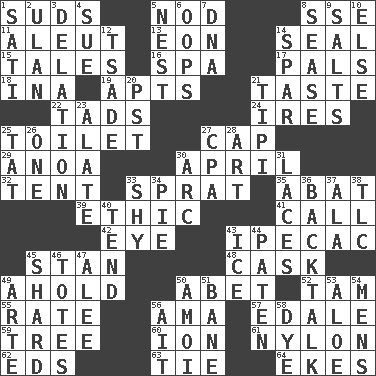 ACROSS 1. Beer foam 5. Dreamland 8. Compass dir. 11. Native American of Southwest Alaska 13. Period of immesurable duration 14. Lick closed 15. Stories 16. Health resort 17. Friends 18. _ tizzy (2 wds.) 19. Tenement units (abbr.) 21. Clothes sense 22. Small amounts or degrees 24. Angers 25. Rest room 27. Head covering 29. Small Philippine buffalo 30. Showery time 32. Portable shelter 33. Small fatty European fish 35. Blind as ____ 39. Moral principle 41. Give a ring to 42. Sight organ 43. Medicinal drug used to evoke vomiting 45. Comedian Laurel of Laurel & Hardy 48. Keg 49. Hold, grip (Informal) 50. Collude with 52. Scottish cap 55. Pace 56. Housemaid (var.) 57. Peak District village in England 59. Family _ (genealogy) 60. Electrically charged atom 61. High-strength synthetic material 62. Begley and Asner 63. Make a knot 64. Makes supply last DOWN 1. Suttee (variant) 2. Uhlan (variant) 3. Conveyance 4. Take to court 5. Egg locale 6. I made a mistake 7. Heredity factor (abbr.) 8. Gospel singer Marvin 9. Table seasonings 10. Otherwise 12. Sadhe (variant) 14. Coast Guard woman 20. Pacific Standard Time (abbr.) 21. Native american tent (variation) 23. Having winglike extensions 25. Make lace 26. Single 27. Numbers guy (abbr.) 28. Nonscientific branch of learning 30. Curve 31. Shoestrings 33. Like a shrinking violet 34. Sliced dessert 36. Sass 37. In the manner of 38. Affectionate concern, for short 40. Be inclined (to) 43. Frozen water 44. Eucharist need 45. Pottery fragment 46. Hauls 47. Toward shelter 49. Johnson of "Laugh-In" 50. Mine, in Marseilles 51. Object of repulsion 53. Medicinal plant 54. Not women's 56. Small island 58. Color