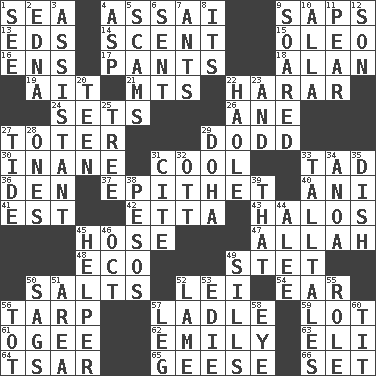 ACROSS 1. Ocean 4. Slender Brazilian palm 9. Plant excrements 13. Begley and Asner 14. Aroma 15. Butter sub 16. Followers of ems 17. Leg coverings 18. ____ Jay Lerner 19. Small island 21. Mountains (abbr.) 22. Ethiopian city, capital of Harari 24. Arranges properly for use 26. One (Scot) 27. Carrier 29. Texas town _ City 30. Silly 31. Calm and collected 33. Small boy 36. Lair 37. Curse 40. Cuckoo 41. Eastern Standard Time (abbr.) 42. Singer James 43. Saint headwear 45. Flexible conduit 47. Assad's deity 48. Environmental prefix 49. Proofreading order 50. Table seasonings 52. Flowery wreath 54. Ewer handle 56. Canvas cover 57. Dipping utensil 59. Car dealer's back yard 61. Double curve, resembling the letter S 62. Poet Dickinson 63. Connecticut Ivy Leaguer 64. Russian ruler of old 65. Honkers 66. Put into a specified state DOWN 1. Perceive with the eye 2. Pulitzer Prize-winning author Ferber 3. Aide 4. Cleo's killer 5. Fraudulent business schemes 6. Posted 7. Pismires 8. ___ a Wonderful Life 9. Flew 10. Silent film actress Nazimova 11. Lightbulb-shaped fruit 12. Boy, to dad 20. Adolescent 22. White Person, in Hawaii 23. Plus 25. Woody plant 27. Event that recurs at intervals 28. Washington bills 29. Capital of the state of Qatar 31. Quote 32. Baseball player Mel 33. Baron Munchausen's specialties 34. Small Philippine buffalo 35. Food container 38. Mexican monetary units 39. Not this but _ 44. Toward shelter 45. Assistant 46. Sep. follower 49. Beverly of Met fame 50. Sinks 51. Length times width 52. Unable to walk 53. Singer Brickell 55. Hero or heavy, e.g. 56. Small child 57. Part of a journey 58. Sight organ 60. Teat (slang)