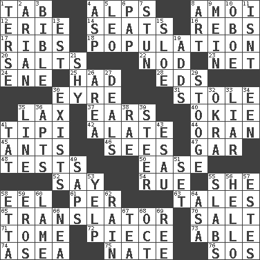 ACROSS 1. Keyboard key 4. High mountains 8. Mine, in Marseilles 12. One of the Great Lakes 14. Theater features 16. Confederate soldiers (slang) 17. Teases 18. Census information 20. Table seasonings 22. Allow head to fall sleepily 23. Remaining after all deductions 24. Compass dir. 25. Possessed 28. Begley and Asner 30. Jane of fiction 31. Fur scarf 35. Not strict 37. Hearing organs 40. Migrant worker of the '30s 41. Native american tent (variation) 42. Having winglike extensions 44. NW Algerian seaport 45. Pismires 46. Perceives with the eye 47. Slender fish 48. Trials 50. Comfort 52. Declare 54. Regret 55. A female animal or person 58. Snakelike fish 61. For each 63. Falsehoods 65. Interpreter 70. Table seasoning 71. Heavy book 72. Part 73. Competent 74. Toward the sea 75. Nathan's nickname 76. Mayday DOWN 1. Laconic 2. Believer in; advocate of (suffix) 3. God's Word 4. Cleo's killer 5. Lion 6. Infant food 7. Make senseless or dizzy 8. Tate display 9. Chow _ 10. Mitch Miller's instrument 11. Is not 13. Eastern Standard Time (abbr.) 15. _ gin 19. Does sums 21. Like a shrinking violet 26. Type of rug 27. Allots cards 29. Moe Howard, for one 30. Has an existence 32. Gumbo ingredient 33. One who doesn't tell the truth 34. Car or cant ending 35. Actor's bit 36. Flats, for short 38. Actress Charlotte 39. Bull 41. Make lace 43. Son of Isaac 49. Plant excrements 51. Arrange properly for use 53. Sharp bark 55. Thick slices 56. Phone greeting 57. _____ Park, CO 58. Singer James 59. Greek god of love 60. Unable to walk 62. Water falling in drops from the sky 64. White ___ sheet 66. Teachers' org. 67. Afternoon social gathering 68. Sep. follower 69. Portuguese money of account (variant)