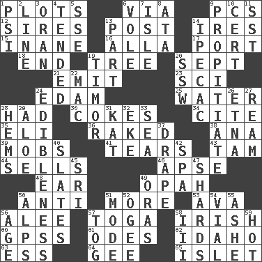ACROSS 1. Schemes 6. By way of 9. Personal Computers (abbr.) 12. Male parents of animals 13. Mail 14. Angers 15. Empty; void 16. Silent film actress Nazimova 17. Sweet dark-red dessert wine 18. Conclusion 19. Family _ (genealogy) 20. Back-to-school mo. 21. Send forth 23. _-fi 24. Dutch treat 25. Wetness 28. Possessed 30. Popular sodas 34. Quote 35. Connecticut Ivy Leaguer 36. Moved through 38. Santa ___, CA 39. Disorderly crowds 41. Lacerates 43. Scottish cap 44. Makes a sale 46. Domed church section 48. Ewer handle 49. Brightly colored fish 50. Opposed to 51. Greater amount 53. Actress Gardner 56. Toward shelter 57. Ancient Roman robe 58. From or relating to Ireland 60. Global Positioning Systems (abbr.) 61. Lyric poems 62. Potato state 63. Double-curved letter 64. Turn to the right 65. Small island DOWN 1. Air pressure measure (abbr.) 2. Actor's bit 3. Northwest Algerian city 4. Looked after 5. Compass dir. 6. Short-tailed, large-bodied rat 7. Capri or Wight 8. "One Day ___ Time" 9. Conciliate 10. Sure thing 11. Fast jet (abbr.) 13. Role in a play 14. Medicinal drug used to evoke vomiting 19. Southeast Indonesia island 20. Compass dir. 22. Big _ 24. The property of being fit to eat 26. Inactive volcano in Sicily 27. 480, 500 or 516 sheets of paper 28. Is hesitant and indecisive 29. Medicinal plant 31. Krazy ___ of comics 32. Make supply last 33. Ocean 37. Window treatment 40. Chalkboards 42. Health resort 45. Indian title of respect (Mr.) 47. Broken pieces 49. Mouths or openings 50. High mountains 51. Method 52. Double curve, resembling the letter S 54. Small bottle 55. American tennis player Robert 56. Personal question 57. Coat; cloak 58. One more than two 59. Being at a high temperature