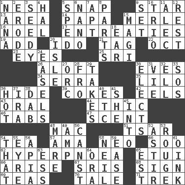 ACROSS 1. Delicate 5. Fastener 9. Play the lead 13. Type of rug 14. Dad 15. Haggard of country music 16. Christmas carol 17. Pleas 19. Find the sum of 20. Wedding promise 21. Label 22. Sep. follower 23. Sight organs 25. _ Lanka 26. Upward 30. Nights before holidays 34. Spanish missionary in California 35. _ and Stitch 36. Flintstone garb 39. Popular sodas 42. Snakelike fish 43. Spoken 44. Principle of right and wrong 46. Bar bills 47. Aroma 48. Big _ 51. Russian ruler of old 54. Beverage made from leaves 57. Nanny (var.) 58. Modern: prefix 60. "Barney Miller" actor Jack 62. Abnormally rapid or deep breathing 65. Needle case 66. Ascend 67. Indian titles of respect 68. Omen 69. Beverages made from leaves 70. Story 71. Long journey DOWN 1. Grandmother 2. Wear away 3. Morally degraded 4. Actor Linden 5. Moved rapidly 6. Billionth: prefix 7. Fitting 8. Components 9. Arrange properly for use 10. Musical group of three 11. Actor Baldwin 12. Take ten 15. Wise men 18. Hearing organ 20. Capri or Wight 24. Artist's stands 27. The grampus (Milton) 28. Away 29. Proceeds 30. Opts 31. Compete 32. Pipe bend 33. Mayday 36. Being at a high temperature 37. Retirement account (abbr.) 38. Apply (a substance) by light strokes 40. And so on (abbr.) 41. A female animal or person 45. To the inside or interior of 48. Female horse 49. Electrical Unit 50. 2nd pers. sing. pres. of can (arch.) 52. Moving or stirring 53. Makeup applied to the cheeks 54. Not this but _ 55. Jane of fiction 56. Capital of Western Samoa 58. Famous astronaut Armstrong 59. Comfort 61. Pig sound 63. Curvy letter 64. Mouth or opening 65. Eastern Standard Time (abbr.)