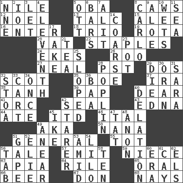 ACROSS 1. The longest river in the world 5. Chief or king in Benin or Nigeria 8. Crow sounds 12. Christmas carol 13. Baby powder 15. Toward shelter 16. Keyboard key 18. Musical group of three 19. Roll call or roster of names 20. Large container 22. Paper fasteners 24. Supplements with great effort 26. Friend of Pooh 27. Actress Patricia 28. Pacific Standard Time (abbr.) 29. Two (Sp.) 32. Native of Scotland 35. Mitch Miller's instrument 37. Lyricist Gershwin 38. Hyperbolic tangent 39. Infant food 40. Letter starter 41. The grampus (Milton) 42. Lick closed 43. Pulitzer Prize-winning author Ferber 44. Had dinner 45. It would 46. Slanted text style (abbr.) 49. Alias (abbr.) 50. Grandmother 51. Commissioned military rank 55. Small child 56. Story 57. Give off 59. Sibling's daughter 63. Capital of Western Samoa 64. Cause heat under the collar 65. Taken by mouth 66. Fermented drink made from hops 67. Spanish title 68. Negative votes DOWN 1. Compass dir. 2. Electrically charged atom 3. Allow 4. Veterans Day date 5. Baseball player Mel 6. Taverns 7. Set down 8. Monte _, Las Vegas Hotel/Casino 9. _ vera 10. Soaks 11. Ocean 14. Unrefined 17. Immoral or dissolute person 21. Afternoon social gathering 23. Cooking vessel 25. Slanted 28. Cotton for raincoats, e.g. 29. Passed on 30. Northwest Algerian city 31. "Two Mules for Sister ____" 32. Portico 33. Haul 34. At one time in the past 36. Sound made by sheep 40. Conveyance 42. A viewer who gazes fixedly 45. Mamie's husband 47. Make lace 48. At once, immediately (arch.) 49. Approach 51. Yawn 52. Writer Wiesel 53. Among 54. _ and Stitch 56. Keyboard key 58. Nine, plus one 60. Period 61. Island 62. Raised railways