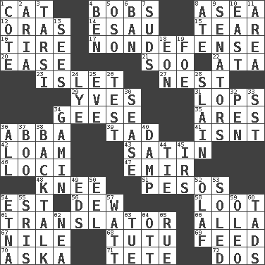 ACROSS 1. Domesticated feline 4. Moves up and down 8. At sea 12. Mouths or openings 14. Son of Isaac 15. Lacerate 16. Hoop that covers a wheel 17. Unrelated to defense, as in spending 20. Relaxation 21. "Barney Miller" actor Jack 22. "One Day ___ Time" 23. Small island 27. A home for chicks 29. Jacques Cousteau's middle name 31. Chops off 34. Honkers 35. Ancient Greek god of war 36. Swedish rock group 39. Small amount or degree 41. Is not 42. Rich soil 43. Smooth fabric 46. Locales 47. Independent ruler or chieftain 48. Leg joint 51. Mexican monetary units 54. Eastern Standard Time (abbr.) 56. Morning condensation 58. Spoils 61. Interpreter 66. Silent film actress Nazimova 67. Mediterranean tributary 68. Ballerina skirt 69. Nourish 70. "____ silly question..." 71. False hair 72. Two (Sp.) DOWN 1. ____ d'Azur (French Riviera) 2. Roberta Peters solo 3. Tarsus (plural) 4. Benjamin's nick name 5. Bear (Spanish) 6. Forbid 7. Beer foam 8. Had dinner 9. Elected representatives 10. 90 degrees 11. Type of rug 13. Observes 18. Period of immesurable duration 19. Enemy 24. Potassium hydroxide 25. First lady 26. Trial 28. Killed 30. Gospel singer Marvin 32. Animal enclosure 33. Fast jet (abbr.) 34. Homeless child 36. Everything 37. Oct. 31 cry 38. Sass 40. Moist 44. Neckwear 45. Big collection agency 49. Begley and Asner 50. Snakelike fish 52. Norwegian king 53. Having a sole or soles 54. Inactive volcano in Sicily 55. Indian titles of respect 57. Electrical Unit 59. Butter sub 60. Bits 62. Teachers' org. 63. Third day of the wk. 64. Baseball player Mel 65. Regret