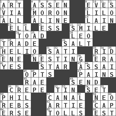 ACROSS 1. Nonscientific branch of learning 4. NE Netherlands city 9. Nights before holidays 13. By way of 14. Person of subnormal intelligence 15. _ and Stitch 16. 100% 17. Place in a line 18. (Had) reclined 19. Pipe bend 21. Curvy letter 22. Grin 24. Frog relative 26. Lion 27. Buy and sell 29. Table seasoning 30. Sun: prefix 31. Suttee (variant) 33. To free from 36. Compass dir. 37. Inhabiting a nest 40. Period 41. It is so 42. Play the lead 43. Slender Brazilian palm 45. Elects 47. Aches 48. Actress Charlotte 49. Transmit 50. Streamer paper 52. Shallow baking pan 54. Arrange properly for use 56. Silvers or Donahue 57. Lessep's creation 59. Modern: prefix 61. Confederate soldiers (slang) 62. Nick name for Arthur 63. Head covering 64. Celtic language 65. For Whom the Bell _____ 66. Eastern Standard Time (abbr.) DOWN 1. Actress Gardner 2. Cause heat under the collar 3. Baron Munchausen's specialties 4. Wet nurse (var.) 5. Having a sole or soles 6. Indian titles of respect 7. Immeasurably long periods of time 8. Compass dir. 9. American author Paul (1891-1958) 10. Small bottle 11. Writer Wiesel 12. Boy, to dad 20. Farming town in central California 22. Killed 23. Cartoonist voice _ Blanc 25. A really long time 27. Those people 28. French philosopher Descartes 29. Disorderly outburst 31. Fast planes 32. "One Day ___ Time" 33. Home 34. SW Asia republic 35. Raised platform 38. First name in cosmetics 39. Open wide 44. Without 45. Threatening words 46. Infant food 49. Slow-paced one 50. "Mermaids" star 51. Chest bones 52. Pacific island yam 53. International (abbr.) 55. Beverages made from leaves 56. Before (prefix) 57. Feline 58. French article 60. Choose