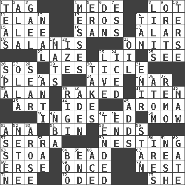 ACROSS 1. Label 4. Ancient Persian 8. Car dealer's back yard 11. Style 13. Greek god of love 14. Become fatigued 15. Toward shelter 16. Without 17. Having or resembling wings 18. Deli grouping 21. Leaves out 22. Goldbrick 23. Cards in a Roman deck? 25. Observe 26. Mayday 29. One of the two male reproductive glands 32. Entreaties 34. "___ Maria" 35. Make imperfect 38. Actor Alda or Thicke 39. Swept the length of 41. Detail 43. Tate display 44. Binary compound 45. Odor 46. Swallowed 50. Cut the grass 51. Wet nurse (var.) 54. Storage container 55. Extremities 57. Father Junipero _ 59. Snuggling 63. Portico 64. Necklace unit 67. Type of rug 68. Celtic language 69. Single time 70. A home for chicks 71. Born 72. Wrote a lyric poem 73. A female animal or person DOWN 1. Afternoon social gatherings 2. Silent film actress Nazimova 3. Highlander 4. Makes clutter 5. Period 6. Spanish title 7. Double-curved letter 8. Ms. Damita and namesakes 9. Speak pompously 10. Laconic 12. Actress Patricia 14. Scottish cap 19. Floor protectors 20. Ending with capital 21. Petroleum 23. Moving, as bait 24. On the rocks 26. Health resort 27. Spanish pot 28. Scorch 30. Proceeds 31. Arab leader 33. Opposed to 36. Tiny particle 37. San ____ (Riviera town) 39. Swiss mountan, "Queen of the Mountains" 40. Arabian gulf 42. Informal term for the mouth 45. Sums up 47. Basketball assoc. 48. Looked after 49. Compass dir. 51. NE Netherlands city 52. Distance measurement (Brit.) 53. Came up 56. Comedian Laurel of Laurel & Hardy 58. Actress Charlotte 60. Angers 61. Delicate 62. Yard entry 64. Sometimes accompanies a hiss 65. Conclusion 66. Adept person