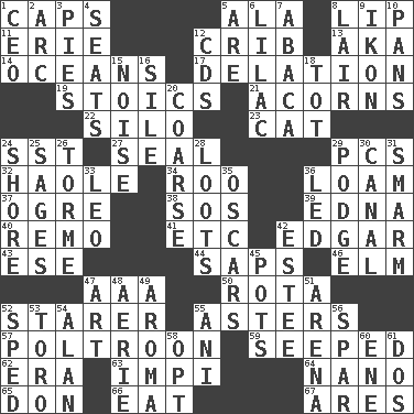 ACROSS 1. Smile enhancers 5. Insect wing 8. Mouth edge 11. One of the Great Lakes 12. Baby bed with high sides 13. Alias (abbr.) 14. Seas 17. Accusation by an informer 19. Unemotional ones 21. Oak nuts 22. Grain storage tower 23. Domesticated feline 24. Fast jet (abbr.) 27. Lick closed 29. Personal Computers (abbr.) 32. White Person, in Hawaii 34. Friend of Pooh 36. Rich soil 37. Legendary monster 38. Distress signal 39. Pulitzer Prize-winning author Ferber 40. San ____ (Riviera town) 41. And so on (abbr.) 42. _ Allan Poe 43. Compass dir. 44. Plant excrements 46. Shade tree 47. American Automobile Association (abbr.) 50. Roll call or roster of names 52. A viewer who gazes fixedly 55. Michaelmas daisies 57. Characterized by complete cowardliness 59. Oozed 62. Epoch 63. Body of Kaffir warriors 64. Billionth: prefix 65. Spanish title 66. Erode 67. Ancient Greek god of war DOWN 1. Corporate head (abbr.) 2. Curve 3. Sliced desserts 4. Theater features 5. "We ___ not amused" (Victoria) 6. Pale purple color 7. Phillipine bananalike plant 8. Den 9. Image 10. Baking dishes 12. Music discs 15. Annoying sound 16. Drop; flow; fall 18. Small child 20. Unrefined 24. Dinah or Pauly 25. Gurus 26. Singer Mel 28. Plunders 29. Plash 30. Lessep's creation 31. Excessive but superficial compliments 33. Lion 35. Motion picture awards 36. Directed 42. First name in cosmetics 45. Cooking vessels 47. Nonscientific branch of learning 48. Nest on high 49. Odor 51. Sports stadium 52. Hurried 53. "Corrida" creature 54. Actor Alda or Thicke 55. Cuckoo 56. Practice fight 58. Elect 60. Compass dir. 61. Two (Sp.)