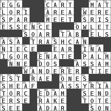 ACROSS 1. Ovum 4. Draw slowly or heavily 8. Floor covering 11. Australian parrot (variant) 13. Type of rug 14. Past tense of be (plural) 15. Practice fight 16. Confront 17. Indian titles of respect 18. Gist 21. A small or young owl 22. Fly high 23. Keyboard key 25. Raised railways 26. White ___ sheet 29. File 13 32. Sibling's daughter 34. Ewer handle 35. _ tizzy (2 wds.) 38. Composer Stravinsky 39. Maternal 41. Inside of hand 43. Compass dir. 44. Two (Sp.) 45. Indian state 46. Roamer 50. Standoff 51. Eastern Standard Time (abbr.) 54. Actress Charlotte 55. Singles 57. Bundle of cut stalks of grain 59. Nineveh was its capital 63. Torque (variant) 64. Dutch treat 67. Transmit 68. Celtic language 69. Libertine 70. Carry 71. Perceive with the eye 72. The sixth month of the Jewish calendar 73. Male child DOWN 1. Otherwise 2. Republicans 3. Pate de foie ____ 4. Device for capturing images 5. "We ___ not amused" (Victoria) 6. To riddle 7. Make lace 8. Haggard of country music 9. Satellite of Uranus 10. Trials 12. Angers 14. Compass dir. 19. Musical sound 20. 4-wheeled motor vehicle 21. Chief or king in Benin or Nigeria 23. Not this but _ 24. 1/640 square mile 26. Black tropical American cuckoo 27. Public display of a written message 28. Period of immesurable duration 30. Gospel singer Marvin 31. Cuts off 33. Ship's personnel 36. Political cartoonist Thomas 37. Jai ____ 39. Pulitzer Prize-winning author Ferber 40. Thickened enlargement 42. Madame (abbr.) 45. Ancient Greek god of war 47. Sandy's bark 48. Wanderer 49. Followers of ems 51. _____ Park, CO 52. Dinah or Pauly 53. Laconic 56. System (abbr.) 58. Adept person 60. Vintage cars 61. To the inside or interior of 62. An important port of Yemen 64. Period 65. Male parent 66. Alias (abbr.)