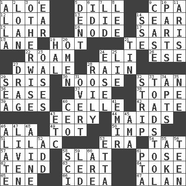 ACROSS 1. Medicinal plant 5. Deli pickle 9. Tax preparer (abbr.) 12. Globular water bottle used in Asia 13. Singer Brickell 14. Shrivel 15. Cowardly lion portrayer 16. Connecting point 17. Indian skirt 18. A saturated hydrocarbon 19. Being at a high temperature 21. Trials 22. Wander aimlessly 24. Biblical high priest 26. Compass dir. 27. A sleeping potion; an opiate (poet.) 28. Precipitation 29. Indian titles of respect 30. Trap for birds or small mammals 32. Comedian Laurel of Laurel & Hardy 36. Comfort 37. Compete 38. Drink excessively 39. Eons 40. Cell (Danish) 42. Pace 43. Suggestive of the supernatural 44. Women servants 46. Insect wing 49. Small child 50. Naughty children 51. Pale purple color 53. Epoch 54. Make lace 57. Enthusiastic 58. Narrow board 61. Airs 62. Watch over 63. An absolute certainty 64. Puff or smoke 65. Compass dir. 66. It may be bright or harebrained 67. ____ Jay Lerner DOWN 1. Silent film actress Nazimova 2. Grant temporary use of 3. Else 4. Ewer handle 5. Undesirable depression on a surface 6. Wedding promise 7. Hat (slang) 8. Area sheltered from the wind 9. Desist 10. Components 11. Get up 14. Compass dir. 19. Actor Linden 20. Presage 21. Metal container 23. Fertile tracts in a desert 24. Artist's stand 25. Untruth 27. To draw with force 28. Turbulent 29. Ocean 31. Unconcealed 32. Empty completely 33. Inedible or poisonous agaric 34. Tenement units (abbr.) 35. Born 40. Corporate head (abbr.) 41. Independent ruler or chieftain 43. And so on (abbr.) 45. Nanny (var.) 46. Having winglike extensions 47. Make or become more lively 48. Place in a line 52. Find the sum of 53. Singer James 55. "____ silly question..." 56. Adolescent 58. _-fi 59. Directed 60. "We ___ not amused" (Victoria) 61. Parent Teacher Association (abbr.)