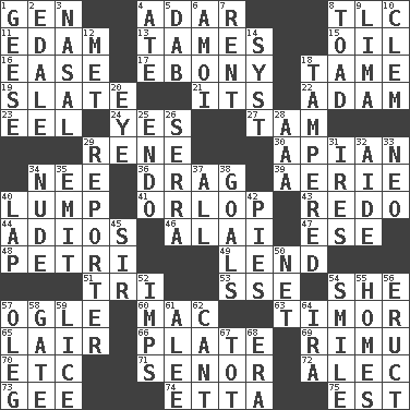 ACROSS 1. Commissioned military rank (abbr.) 4. The sixth month of the Jewish calendar 8. Affectionate concern, for short 11. Dutch treat 13. Makes less strong or intense 15. Lubricate 16. Comfort 17. Dark wood 18. Docile 19. Chalkboard 21. It is 22. First man 23. Snakelike fish 24. Affirmative reply 27. Scottish cap 29. French philosopher Descartes 30. Bee-related 34. Born 36. To draw with force 39. Nest on high 40. Mass 41. Fourth or lowest deck 43. Redecorate 44. Goodbye (Sp.) 46. Jai ____ 47. Compass dir. 48. _ dish (used to culture cells) 49. Grant temporary use of 51. Three (prefix) 53. Compass dir. 54. A female animal or person 57. Stare at amorously 60. Big _ 63. The easternmost of the Lesser Sundas 65. Den 66. Food holder 69. Tall New Zealand timber tree 70. And so on (abbr.) 71. Sir (Sp.) 72. Actor Baldwin 73. Turn to the right 74. Singer James 75. Eastern Standard Time (abbr.) DOWN 1. Honkers 2. Peak District village in England 3. Rhinal 4. Had dinner 5. Apply (a substance) by light strokes 6. Mine, in Marseilles 7. Monthly bill 8. Frog relative 9. Pale green bean 10. Clement's nick name 12. Was introduced to 14. System (abbr.) 18. ________ with (broke a safety seal) 20. Sight organ 25. Inside; within (prefix) 26. Father Junipero _ 28. Auto club (abbr.) 29. News announcer 31. Angers 32. Assistant 33. Modern: prefix 34. Unadorned 35. Give off 37. 100% 38. Finish lines 40. Pet locale 42. Sliced desserts 45. Title for a knight 50. Fish or hair follower 52. Naughty children 54. Grin 55. Residences 56. Spew [out] 57. Cassini of fashion 58. Yard entry 59. Louse (plural) 61. Toward shelter 62. Patter 64. Lyricist Gershwin 67. Small child 68. Epoch