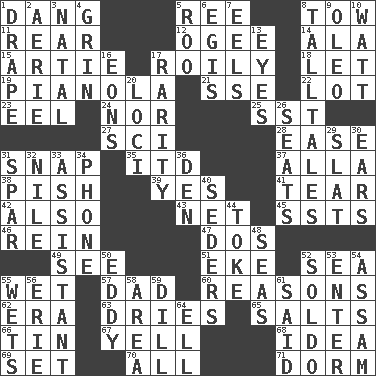 ACROSS 1. Mild oath, euphamism for damn 5. To separate or throw off 8. Pull behind 11. Located in or toward the back 12. Double curve, resembling the letter S 14. Chicken ___ king 15. Nick name for Arthur 17. Turbulent 18. Allow 19. Player piano 21. Compass dir. 22. Car dealer's back yard 23. Snakelike fish 24. And not 25. Fast jet (abbr.) 27. _-fi 28. Comfort 31. Fastener 35. It would 37. Silent film actress Nazimova 38. Expression of disdain 39. Consenting reply 41. Rend 42. In addition 43. Remaining after all deductions 45. Fast planes 46. It's straight from the horse's mouth 47. Two (Sp.) 49. Perceive with the eye 51. Supplement with great effort 52. Ocean 55. Dripping 57. June honoree 60. Thinks logically 62. Epoch 63. Frees from moisture 65. Table seasonings 66. Shallow baking pan 67. Shout 68. The main thing one is thinking about 69. Arrange properly for use 70. Everything 71. Dormintory (informal) DOWN 1. Window treatment 2. Nest on high 3. Brizilian seaport 4. Amused look 5. Friend of Pooh 6. The front part of a cuirass 7. Snakelike fish 8. Baron Munchausen's specialties 9. Butter sub 10. Electrical Unit 13. Sight organs 16. Immeasurably long periods of time 17. Noteworthy scarcity 20. Event scenes 26. Theater features 29. Narrow board 30. Hearing organs 31. Practice fight 32. The longest river in the world 33. Aide 34. Give a jingle 36. Lair 40. Spring feasts 44. Puff or smoke 48. Oceans 50. Whirlpool 52. Twentieth part of a lira 53. Keyboard key 54. Indian state 55. Moistens 56. One of the Great Lakes 58. Type of rug 59. Deli pickle 61. Stated 64. Pipe bend