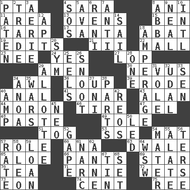 ACROSS 1. Parent Teacher Association (abbr.) 4. "Two Mules for Sister ____" 8. Cuckoo 11. Type of rug 13. Baking chambers 15. Benjamin's nick name 16. Canvas cover 17. Before Barbara or Clara 18. Blind as ____ 19. Prepares for publication 21. One more than two 22. Promenade 23. Born 24. It is so 27. Trim (branches) 29. So be it 30. Mole, birthmark 34. Leather borer 36. Central Nebraska county 39. Eat (away) 40. Of or related to the anus 41. Underwater navigation system 43. Actor Alda or Thicke 44. Person of subnormal intelligence 46. Become fatigued 47. Set 48. Thick mixture 49. Lacquered or enameled metalware 51. Coat; cloak 53. Compass dir. 54. Floor protector 57. Hero or heavy, e.g. 60. Santa ___, CA 63. A sleeping potion; an opiate (poet.) 65. _ vera 66. Leg coverings 69. Play the lead 70. Beverage made from leaves 71. Bert's buddy 72. Moistens 73. Period of immesurable duration 74. Penny 75. To riddle DOWN 1. Eucharist need 2. Barter 3. Nest on high 4. Mayday 5. Actress Gardner 6. Painter Guido (1575-1642) 7. Against 8. Swedish rock group 9. Anneal 10. International (abbr.) 12. Fitting 14. Travel by water 18. Electrical Measurement 20. Symbol (abbr.) 25. Snakelike fish 26. Snout, nose 28. Single 29. One to whom something is allotted 31. Short-tailed, large-bodied rat 32. Allodial 33. Elected rep. 34. Small Philippine buffalo 35. Armed conflicts 37. Single; one (prefix) 38. Components 40. Electrical Unit 42. Vintage cars 45. Modern: prefix 50. Directed 52. Yawn 54. Mother 55. Having winglike extensions 56. Laconic 57. Assign a rank or rating to 58. Butter sub 59. Grant temporary use of 61. Drug cop 62. Singer Murray 64. Compass dir. 67. Shallow baking pan 68. Arrange properly for use