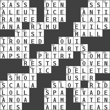 ACROSS 1. Backtalk 5. Lair 8. Fast jet (abbr.) 11. Native American of Southwest Alaska 13. Frozen water 14. Opposed to 15. The wife of a rajah (variant) 16. Period 17. (Had) reclined 18. Santa ___, CA 19. Tall New Zealand timber tree 21. Vices 22. Trial 24. Shopping center 25. Pressed 27. Fr. "Yes" 29. Small pie 30. Shops 32. Domed church section 33. _ dish (used to culture cells) 35. Heavy book 39. Musical pauses 41. Baking chamber 42. Nervous spasm 43. Keyboard key 45. Guess 48. One who makes use of a thing 49. Any of the three canals of the cochlea 50. Narrow opening 52. To free from 55. Hang loosely or laxly 56. Health resort 57. Dodge 59. Small Philippine buffalo 60. Scottish cap 61. Ingested 62. It is so 63. A saturated hydrocarbon 64. Afternoon social gatherings DOWN 1. "Two Mules for Sister ____" 2. ____ Jay Lerner 3. Legislators 4. Take to court 5. South Vietnam president (1954) 6. Shade of tan 7. Teachers' org. 8. Slow-paced one 9. Free of sound 10. Airtight sealed metal containers 12. Laconic 14. Inventor's middle name 20. It would 21. Send forth 23. Keyboard key 25. Call ___ day 26. Hit sharply and swiftly 27. Rowing implement 28. RI univ. 30. Mountains (abbr.) 31. Took without asking 33. Air pressure measure (abbr.) 34. And so on (abbr.) 36. Make much ado about nothing 37. Was introduced to 38. Compass dir. 40. Singer James 43. Superhero pair 44. First name in cosmetics 45. Biscuitlike quick bread 46. Saint headwear 47. Spanish pot 49. Kill 50. Connect, as a bridge 51. Unable to walk 53. The main thing one is thinking about 54. Hiding places for outlaws 56. R.R. building 58. Large container