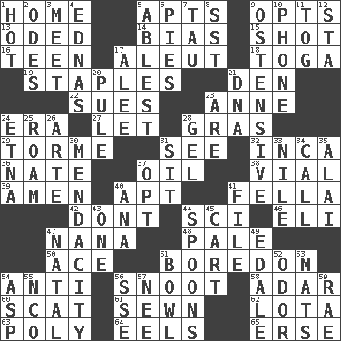 ACROSS 1. Residence 5. Flats, for short 9. Chooses 13. Wrote a lyric poem 14. Prejudice 15. Went for two points 16. Adolescent 17. Eskimo relative 18. Ancient Roman robe 19. Paper fasteners 21. Lair 22. Takes to court 23. Singer Murray 24. Epoch 27. Allow 28. Pate de foie ____ 29. Singer Mel 31. Observe 32. South American Indian 36. Nathan's nickname 37. Lubricate 38. Small bottle 39. So be it 40. Fitting 41. Chap (slang) 42. Do not 44. _-fi 46. Biblical high priest 47. Grandmother 48. Diluted with white 50. Adept person 51. Mood resulting from idleness 54. Against 56. Snob 58. The sixth month of the Jewish calendar 60. Scram, to a cat 61. Stitched 62. Globular water bottle used in Asia 63. More than one (prefix) 64. Snakelike fish 65. Celtic language DOWN 1. Being at a high temperature 2. Lyric poems 3. Confront 4. Ferber et al. 5. Most capable 6. Sliced desserts 7. The 19th letter of the Greek alphabet 8. Fast jet (abbr.) 9. Clearly or manifestly demonstrative 10. Give a jingle 11. Coat; cloak 12. R.R. building 17. Toward shelter 20. Whimper 21. Heredity factor (abbr.) 23. "We ___ not amused" (Victoria) 24. Inactive volcano in Sicily 25. Wander 26. Johnson of "Laugh-In" 28. Set 30. Ananias' fault 31. Be seated 33. "Death on the ____" 34. Give a ring to 35. Jai ____ 37. Elect 40. Santa ___, CA 41. Do some clerical work 43. Single 44. Soup utensils 45. Heavy open wagon 47. Relating to or accompanying birth 49. Peak District village in England 51. Soup holder 52. Aroma 53. Floor coverings 54. Cleo's killer 55. Non-commissioned officer (abbr.) 56. Compass dir. 57. Born 59. Actress Charlotte