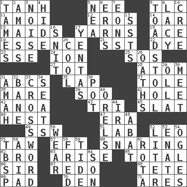 ACROSS 1. Hyperbolic tangent 5. Born 8. Affectionate concern, for short 11. Mine, in Marseilles 12. Greek god of love 14. Rowing implement 15. Women servants 17. Tall tales 18. Adept person 19. Center 21. Fast jet (abbr.) 22. Color 23. Compass dir. 24. Electrically charged atom 25. Distress signal 27. Small child 28. Tiny particle 31. Lettered men learn these first 35. Infant locale 37. Lacquered or enameled metalware 38. Female horse 39. "Barney Miller" actor Jack 41. Hollow 42. Small Philippine buffalo 43. Three (prefix) 45. Narrow board 46. Command 47. Period 49. Compass dir. 51. Experiment locale 52. Lion 55. The 23rd letter of the Hebrew alphabet 57. Newt 60. Catching in a trap 62. Sis' sibling 63. Get up 65. Add up to 66. Title for a knight 67. Make new 68. Wig 69. Writing tablet 70. Lair 71. Ancient Greek god of war DOWN 1. Corrects by punishment or discipline 2. Collect or gather 3. Annoying sound 4. Flintstone garb 5. Teachers' org. 6. Blunders 7. Immeasurably long periods of time 8. Inedible or poisonous agaric 9. Made of lace 10. Algonquian 13. Fast planes 16. In a ____ (agitated or irritated) 17. Gossips 20. Calm and collected 26. Expletives 29. Water jar 30. Rendezvous 31. Nanny 32. Object of repulsion 33. What you're doing now 34. Theater features 36. Cooking vessel 40. Threatening words 44. SW Asia republic 48. Blind as ____ 50. Put on (as clothing) 52. 61 cubic inches 53. Related on the mother's side 54. Stares at amorously 55. Cook's measure (abbr.) 56. Roberta Peters solo 58. Flintstone 59. Event that recurs at intervals 61. Round or rotation of duties 64. Manchild