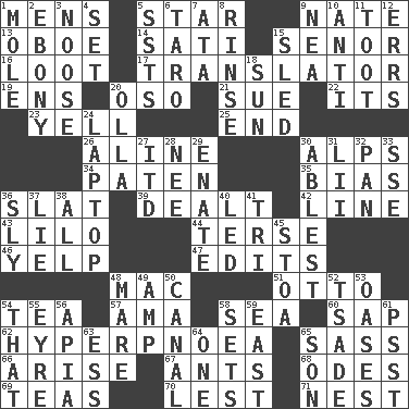 ACROSS 1. Not women's 5. Play the lead 9. Nathan's nickname 13. Mitch Miller's instrument 14. Suttee (variant) 15. Sir (Sp.) 16. Plunder 17. Interpreter 19. Followers of ems 20. Bear (Spanish) 21. Take to court 22. ___ a Wonderful Life 23. Shout 25. Conclusion 26. Place in a line 30. High mountains 34. Eucharist need 35. Prejudice 36. Narrow board 39. Started a card game 42. Actor's bit 43. _ and Stitch 44. Laconic 46. Sharp bark 47. Prepares for publication 48. Apple computer (short form) 51. Von Bismarck 54. Beverage made from leaves 57. Nanny (var.) 58. Ocean 60. Plant excrement 62. Abnormally rapid or deep breathing 65. Backtalk 66. Originate 67. Pismires 68. Lyric poems 69. Afternoon social gatherings 70. For fear that 71. A home for chicks DOWN 1. Undercover agent 2. Black 3. Trap for birds or small mammals 4. Put into a specified state 5. Fast planes 6. Pacific island yam 7. _ moment's notice (2 wds.) 8. Wash lightly 9. Teachers' org. 10. Against 11. A blast of a horn 12. Blunders 15. Downhill vehicle 18. Player for Phoenix 20. Spanish pot 24. Portable computer 27. It would 28. Born 29. Related on the mother's side 30. Most capable 31. Cards in a Roman deck? 32. Baking dish 33. Compass dir. 36. Mischievous 37. Falsehood 38. 100% 40. Directed 41. Three (prefix) 45. Portico 48. Female horse 49. Electrical Unit 50. Lessep's creation 52. Sadhe (variant) 53. Fertile tracts in a desert 54. Not this but _ 55. Jane of fiction 56. Capital of Western Samoa 58. Arranges properly for use 59. 90 degrees 61. Inconspicuous attention getter 63. Curvy letter 64. Single 65. Male child