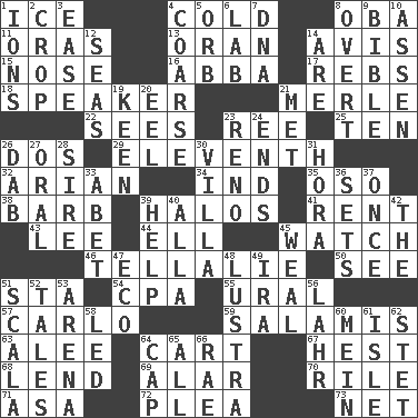 ACROSS 1. Frozen water 4. Chilled 8. Chief or king in Benin or Nigeria 11. Mouths or openings 13. NW Algerian seaport 14. Deliberation 15. Sense of smell 16. Swedish rock group 17. Confederate soldiers (slang) 18. Orator 21. Haggard of country music 22. Observes 23. To riddle 25. Nine, plus one 26. Two (Sp.) 29. Veterans Day date 32. Believer in; advocate of (suffix) 34. Working for oneself (abbr.) 35. Bear (Spanish) 38. Sharp remark 39. Rings 41. Monthly bill 43. Area sheltered from the wind 44. Pipe bend 45. Observe 46. Copy Pinocchio 50. Observe 51. R.R. building 54. Tax preparer (abbr.) 55. Mountain range 57. Monte _, Las Vegas Hotel/Casino 59. Deli grouping 63. Toward shelter 64. Haul 67. Behest 68. Grant temporary use of 69. Having or resembling wings 70. Cause heat under the collar 71. White ___ sheet 72. Entreaty 73. Remaining after all deductions DOWN 1. Charged atoms 2. Riding implement 3. Comfort 4. Unrefined 5. Globe 6. Experiment locale 7. Heredity factor (abbr.) 8. Unconcealed 9. God's Word 10. NE Netherlands city 12. Oceans 14. "We ___ not amused" (Victoria) 19. Peachy ____! 20. Snakelike fish 21. Was introduced to 23. Former U.S. Attorney General Janet 24. Conclusions 26. Apply (a substance) by light strokes 27. Taken by mouth 28. Father 30. Country residence 31. Israeli folk dance 33. Collude with 36. Arranges properly for use 37. Single time 39. Aid 40. Silent film actress Nazimova 42. Definite Article 45. Welt 47. Environmental prefix 48. A period of five years 49. Lyricist Gershwin 51. Any of the three canals of the cochlea 52. Lies 53. Sports stadium 56. Cowardly lion portrayer 58. Directed 60. Chow _ 61. Small island 62. Proofreading order 64. Head covering 65. Everything 66. Actress Charlotte