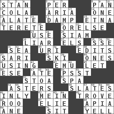 ACROSS 1. Comedian Laurel of Laurel & Hardy 5. For each 8. Baking dish 11. Root beer relative 12. Operatic vocal solo 14. Single 15. Having winglike extensions 17. Moist 18. Inactive volcano in Sicily 19. Cigar-shaped 21. Threatening words 23. Purpose 25. Thailand, formerly 26. One who doesn't tell the truth 27. Raised railways 28. Compass dir. 31. Ocean 33. RI univ. 35. Proofreads 37. Indian skirt 38. What Jean-Claude Killy likes to do 40. Washington bills 41. Exploiting 43. Australian flightless bird 45. Allow 46. Compass dir. 47. Had dinner 50. Inconspicuous attention getter 52. Portico 53. Health resort 54. Michaelmas daisies 56. Chalkboards 61. Inwardly 62. Count _ (2 wds.) 65. Collection of objects 66. Friend of Pooh 67. Writer Wiesel 68. Capital of Western Samoa 69. A saturated hydrocarbon 70. Be seated 71. Shout DOWN 1. Jazz singing style 2. Lacquered or enameled metalware 3. Having or resembling wings 4. Nathan's nickname 5. Groovy apt. 6. Epoch 7. Full of chinks, cracks, or crevices 8. Cooking vessels 9. Queen of England 1702-14 10. Teachers' org. 13. Showery time 16. Needle case 18. Shade tree 20. He sold his birthright 22. Relaxation 24. Blunders 26. (Had) reclined 28. Trig term 29. Proofreading order 30. Double-curved letter 31. Backtalk 32. One of the Great Lakes 34. Eisenhower's nickname 36. Dunce 37. Institute legal proceedings 39. Naughty children 42. Yard entry 44. United States Postal Service (abbr.) 48. Singer Mel 49. Artist's stands 51. Table seasoning 52. Filthy place 54. At once, immediately (arch.) 55. A type of plum 57. Like ___ of sunshine 58. Drink excessively 59. Tending to cause great harm 60. Lick closed 61. Lyricist Gershwin 63. One more than two 64. Fish or hair follower