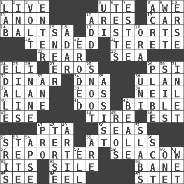 ACROSS 1. Moving, as bait 5. Shoshoni 8. Deep reverence 11. Soon (poet.) 12. Ancient Greek god of war 13. Automobile 14. Greek mezzo-soprano Agnes 17. What propaganda does 19. Watched over 21. Cigar-shaped 22. Hitchcock's "____ Window" 23. Ocean 24. Biblical high priest 27. Greek god of love 29. 23rd letter of the Greek alphabet 32. Middle Eastern gold or silver currency 34. Heredity factor (abbr.) 36. ____ Bator, Mongolia 37. ____ Jay Lerner 38. Greek goddess of the dawn 39. Famous astronaut Armstrong 40. Actor's bit 41. Two (Sp.) 42. God's Word 43. Compass dir. 44. Hoop that covers a wheel 46. Eastern Standard Time (abbr.) 47. Parent Teacher Association (abbr.) 50. Oceans 52. A viewer who gazes fixedly 55. Ringlike coral islands and reefs 57. Newsperson 59. Manatee 62. It is 63. Filth; sediment 64. Object of repulsion 65. Perceive with the eye 66. Snakelike fish 67. Proofreading order DOWN 1. Experiment locale 2. _ tizzy (2 wds.) 3. Electrical Unit 4. Keyboard key 5. RI univ. 6. Trials 7. First name in cosmetics 8. Measure of real estate 9. Electrical Unit 10. Celtic language 12. Say or write further 15. Contemptuous expression 16. The sixth month of the Jewish calendar 18. Mouth or opening 20. Worn away 24. Peak District village in England 25. Ms. Damita and namesakes 26. Empty; void 28. Snout, nose 29. Military trainee 30. Moves on water 31. An arm off of a larger body of water 33. A saturated hydrocarbon 35. Help 36. Corn or form start 42. Memphis, Tenn. Street 45. Vintage cars 47. Adept person 48. Laconic 49. Nick name for Arthur 51. Broad, flat, thick pieces 52. Indian titles of respect 53. Wig 54. Domed church section 55. "We ___ not amused" (Victoria) 56. Jazz singing style 58. Pipe bend 60. Single 61. Soggy