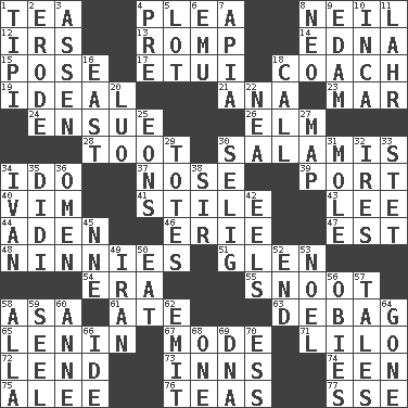 ACROSS 1. Beverage made from leaves 4. Entreaty 8. Famous astronaut Armstrong 12. Big collection agency 13. Frolic 14. Pulitzer Prize-winning author Ferber 15. Introduce or present, as a question 17. Needle holder 18. Team commander 19. Perfect 21. Santa ___, CA 23. Make imperfect 24. Follow as a consequence or result 26. Shade tree 28. A blast of a horn 30. Deli grouping 34. Wedding promise 37. Sense of smell 39. Sweet dark-red dessert wine 40. Zeal 41. Vertical member of a panel or frame 43. Area sheltered from the wind 44. An important port of Yemen 46. One of the Great Lakes 47. Eastern Standard Time (abbr.) 48. Fools 51. Small, secluded valley 54. Epoch 55. Snout, nose 58. White ___ sheet 61. Had dinner 63. Debunk (Brit. slang) 65. Soviet premier 1918-24 67. Method 71. _ and Stitch 72. Grant temporary use of 73. Taverns 74. Car or cant ending 75. Toward shelter 76. Beverages made from leaves 77. Compass dir. DOWN 1. Native american tent (variation) 2. Wear away 3. NE Netherlands city 4. Before (prefix) 5. Car dealer's back yard 6. Australian flightless bird 7. Capital of Western Samoa 8. Modern: prefix 9. Dutch treat 10. South American Indian 11. Cowardly lion portrayer 16. 90 degrees 18. Give a ring to 20. Nilotic language 22. Teachers' org. 25. Immeasurably long periods of time 27. Atlas unit 29. Hauls 30. Major League Baseball Commissioner Bud 31. Undercover agent 32. Angers 33. Proofreading order 34. _ the terrible 35. "You Light Up My Life" star Conn 36. Sign of things to come 38. Title for a knight 42. Snakelike fish 45. Compass dir. 49. SW Asia republic 50. Erode 52. Conclusion 53. Christmas carol 56. Off-Broadway awards 57. Falsehoods 58. Silent film actress Nazimova 59. Sew up the eyelids of hawks and falcons 60. Queen of England 1702-14 62. Give off 64. Went 66. Binary compound 68. Single 69. Heredity factor (abbr.) 70. Double-curved letter