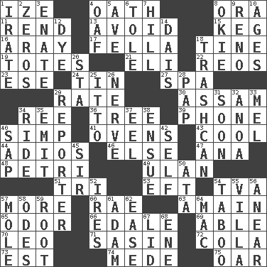 ACROSS 1. Ending with capital 4. Pledge 8. Mouth or opening 11. Tear apart 13. Prevent from happening 15. Cask 16. Like ___ of sunshine 17. Chap (slang) 18. Prong on a fork 19. Hauls 21. Connecticut Ivy Leaguer 22. Vintage cars 23. Compass dir. 24. Shallow baking pan 27. Health resort 29. Assign a rank or rating to 30. Indian state 34. To separate or throw off 36. Relationship diagram 39. Give a jingle 40. Simple or foolish person 41. Baking chambers 43. Calm and collected 44. Goodbye (Sp.) 46. Otherwise 47. Santa ___, CA 48. _ dish (used to culture cells) 49. Uhlan (variant) 51. Three (prefix) 53. Lizard (obsolete) 54. Federal power corp. 57. Greater amount 60. Actress Charlotte 63. At full speed 65. Scent 66. Peak District village in England 69. Competent 70. Lion 71. Indian antelope 72. Root beer relative 73. Eastern Standard Time (abbr.) 74. Ancient Persian 75. Rowing implement DOWN 1. Feeling or showing extreme anger 2. Nothings 3. Related on the mother's side 4. Clumsy lout 5. "___ Maria" 6. Lacquered or enameled metalware 7. Land elevation 8. Migrant worker of the '30s 9. Former U.S. Attorney General Janet 10. Grows older 12. Color 14. Raised platform 18. File 13 20. R.R. building 25. "Tell ____ the Marines!" 26. Boldness 28. Infant food 29. Newsperson 31. Within a short period 32. Small Philippine buffalo 33. Cartoonist voice _ Blanc 34. Travel on or in a vehicle 35. Send forth 37. Snakelike fish 38. Take place subsequently 40. Plant excrement 42. Automatic 45. Title for a knight 50. "One Day ___ Time" 52. Angers 54. Off limits 55. Country residence 56. Approach 57. Undercover agent 58. Lyric poems 59. Carrot, for example 61. First of billions? 62. Comfort 64. Big _ 67. Hat (slang) 68. Compass dir.