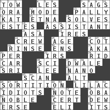 ACROSS 1. Pull behind 4. French article 7. Sinks 11. Mouth or opening 12. Method 13. Chummy 14. Krazy ___ of comics 15. Inactive volcano in Sicily 16. Finds the solution 17. _____ Park, CO 19. Aide 21. White ___ sheet 23. Angers 24. Group working together 25. Personal question 26. Small bed 29. Remove soap 30. Followers of ems 31. Alias (abbr.) 32. For each 33. Big collection agency 34. To free from 35. 4-wheeled motor vehicle 36. _-fi 37. A sleeping potion; an opiate (poet.) 40. _ Lanka 41. Area sheltered from the wind 42. Billionth: prefix 43. Skim 45. Keyboard modifier key 46. Conclusion 51. Pale purple color 55. Foolish or stupid persons 56. Make mention of 58. Chief or king in Benin or Nigeria 59. Having high moral qualities 60. Certainty 61. Morning condensation 62. Celtic language 63. Connecticut Ivy Leaguer 64. ___ a Wonderful Life DOWN 1. Puff or smoke 2. Mouths or openings 3. Electrical Unit 4. Car dealer's back yard 5. Pulitzer Prize-winning author Ferber 6. Oceans 7. Table seasonings 8. Inventor's middle name 9. Small, secluded valley 10. System (abbr.) 12. Makes clutter 13. Introduce or present, as a question 16. Founders of families 18. Merit 20. Attaches a signature 22. Deep reverence 24. High-altitude cloud 25. Nest on high 26. Monte _, Las Vegas Hotel/Casino 27. Migrant worker of the '30s 28. Small boy 29. Tail end 32. Personal Computers (abbr.) 33. Ancient Celtic tribe of eastern Britain 36. Narrow boards 37. Heredity factor (abbr.) 38. Place for singles 39. Against 43. Took without asking 44. Quote 46. Trig term 47. Aroma 48. Teases 49. At one time in the past 50. Christmas carol 52. Farming town in central California 53. Collude with 54. Crow sounds 57. Three (prefix)