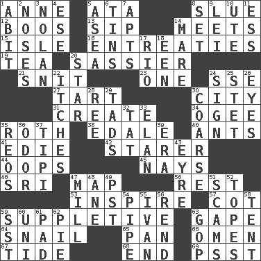 ACROSS 1. Queen of England 1702-14 5. "One Day ___ Time" 8. Turn sharply 12. Expressions of contempt or scorn 13. Small drink 14. Confronts 15. Small island 16. Pleas 19. Beverage made from leaves 20. More disrespectful 21. In a ____ (agitated or irritated) 23. Single 24. Compass dir. 27. Small pie 30. Municipality 31. Make 34. Double curve, resembling the letter S 35. Writer of Portnoy's Complaint (1969) 38. Peak District village in England 40. Pismires 41. Singer Brickell 42. A viewer who gazes fixedly 44. I made a mistake 45. Negative votes 46. Indian title of respect (Mr.) 47. Atlas unit 50. Relief 53. Motivate 57. Small bed 59. Supplementary 63. Yawn 64. Slow-paced one 65. Baking dish 66. Presage 67. Event that recurs at intervals 68. Conclude 69. Inconspicuous attention getter DOWN 1. "This won't hurt ____!" 2. Olfactory organs 3. Pitcher Ryan 4. Compass dir. 5. At sea 6. Airtight sealed metal containers 7. Tenement units (abbr.) 8. Put into a specified state 9. Flowery wreath 10. Shoshoni 11. Double-curved letter 14. Female horse 17. _ de Janeiro 18. Car or cant ending 20. Play the lead 22. Skin irritations 24. Signal 25. Proofreading order 26. Snake ____ (dice throw) 28. Portuguese money of account (variant) 29. Bits 30. Unrefined 32. Make lace 33. Liveliness 35. Vintage cars 36. Scent 37. Native american tent (variation) 39. Period 43. Jane of fiction 47. Place where flour is made 48. A saturated hydrocarbon 49. Pacific Standard Time (abbr.) 51. Fraudulent business schemes 52. Drinks excessively 54. Corncob 55. _ the terrible 56. Tear apart 58. Portable shelter 59. Fast jet (abbr.) 60. University (slang) 61. Writing tablet 62. Sliced dessert 63. Grand Old Party