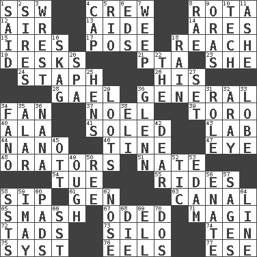 ACROSS 1. Compass dir. 4. Ship's personnel 8. Roll call or roster of names 12. Atmosphere 13. Assistant 14. Ancient Greek god of war 15. Angers 17. Airs 18. Arrive at 19. Writing tables 21. Parent Teacher Association (abbr.) 23. A female animal or person 24. Staphylococcus 26. Part of HMS, perhaps 28. Highlander 30. Commissioned military rank 34. Air blower 37. Christmas carol 39. "Corrida" creature 40. In the manner of 41. Having a sole or soles 43. Experiment locale 44. Billionth: prefix 46. Prong on a fork 47. Sight organ 48. Speakers 51. Nathan's nickname 54. Third day of the wk. 55. Amusement-park features 58. Small drink 61. Commissioned mil. rank 63. Lessep's creation 65. Box-office sellout 67. Wrote a lyric poem 71. Wise men 72. Bits 73. Grain storage tower 74. "___ Little Indians" 75. System (abbr.) 76. Snakelike fish 77. Compass dir. DOWN 1. Alleged 2. Male parents of animals 3. Obtain by seizing forcibly or violently 4. Head covering 5. _ de Janeiro 6. Begley and Asner 7. Shed a tear 8. Actress Charlotte 9. Mouths or openings 10. Technology 11. American tennis player Robert 16. Heroin 18. Water falling in drops from the sky 20. Health resort 22. Definite Article 25. Coop moms 27. Arrange properly for use 29. Plunders 30. American astronaut and politician John 31. Hero or heavy, e.g. 32. Like ___ of sunshine 33. Ear part 34. Papal veil 35. Having or resembling wings 36. Grandmother 38. Biblical high priest 42. Letter starter 45. Baseball player Mel 49. Ending for "Through" and "Enough" 50. To separate or throw off 52. Nervous spasm 53. Dutch treat 56. Maternal 57. Gurus 58. Fast planes 59. "If ____ say so..." 60. Writing tablets 62. Olfactory organ 64. Actor's bit 66. Fast jet (abbr.) 68. Expire 69. Pipe bend 70. Two (Sp.)