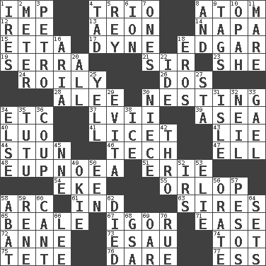 ACROSS 1. Naughty child 4. Musical group of three 8. Smallest unit of an element 12. To separate or throw off 13. Period of immesurable duration 14. California wine valley 15. Singer James 17. Unit of force 18. _ Allan Poe 19. Father Junipero _ 21. Title for a knight 23. A female animal or person 24. Turbulent 26. Two (Sp.) 28. Toward shelter 30. Nestling 34. And so on (abbr.) 37. 57 in ancient Rome 39. Toward the sea 40. Nilotic language 41. It is permitted: Lat. 43. Whopper 44. Astound 46. Technical 47. Pipe bend 48. Normal relaxed breathing 51. One of the Great Lakes 54. Supplement with great effort 55. Lowest deck of a ship 58. Curve 61. Indiana (abbr.) 63. Begets 65. Calif. Air Force Base 67. Russian composer Stravinsky 71. Comfort 72. Queen of England 1702-14 73. Son of Isaac 74. Small child 75. Wig 76. Have the gumption 77. Double-curved letter DOWN 1. Angers 2. Distance measurement 3. Stone: prefix 4. Small boy 5. Marina Del _, California 6. Electrically charged atom 7. Washington bills 8. Also 9. Labels 10. Brightly colored fish 11. Female horse 16. Operatic vocal solo 18. Greek god of love 20. 100% 22. Binary compound 25. Shout 27. R.R. building 29. Webber/Rice musical 30. Sibling's daughter 31. Small island 32. Famous astronaut Armstrong 33. Highlander 34. Otherwise 35. Ballerina skirt 36. Clever action or accomplishment 38. Frozen water 42. Through, poetically 45. Compass dir. 49. Migrant worker of the '30s 50. Car or cant ending 52. Big collection agency 53. Writer Wiesel 56. Declaim 57. Mexican monetary units 58. Blind as ____ 59. French philosopher Descartes 60. Patter 62. Passed on 64. Arranges properly for use 66. Area sheltered from the wind 68. Girls' org. (abbr.) 69. Rowing implement 70. Sorrow