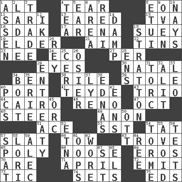 ACROSS 1. Keyboard modifier key 4. Lacerate 8. A really long time 11. Indian skirt 13. Having ears or earlike features 15. Federal power corp. 16. Neighbor of Neb. 17. Sports stadium 18. Chop _ 19. A person who is older than you are 21. Direct toward a target or goal 22. Metal containers 23. Born 24. Environmental prefix 27. For each 29. Sight organs 30. Brizilian seaport 34. Benjamin's nick name 36. Cause heat under the collar 39. Took without asking 40. Left side of a ship or aircraft 41. Miss Universe 1986, Barbara Palacios _ 43. Musical group of three 44. Capital of Egypt 46. Western Nevada city 47. Sep. follower 48. Navigate 49. At once, immediately (arch.) 51. Adept person 53. Fast jet (abbr.) 54. Make lace 57. Narrow board 60. Pull behind 63. Collection of objects 65. More than one (prefix) 66. Trap for birds or small mammals 69. Greek god of love 70. "We ___ not amused" (Victoria) 71. Showery time 72. Give off 73. Nervous spasm 74. Puts into a specified state 75. Begley and Asner DOWN 1. NE Netherlands city 2. Dipping utensil 3. Swap 4. Afternoon social gathering 5. Ewer handle 6. Type of rug 7. Painter Guido (1575-1642) 8. Needle case 9. Baking chamber 10. Negative votes 12. D.D.E's nickname 14. Moist 18. Ski resort town in Vermont 20. Marina Del _, California 25. An absolute certainty 26. Flexible twig of a willow tree 28. Followers of ems 29. Plea 31. Torque (variant) 32. Came down and settled, as after flight 33. Lion 34. Water vessel 35. One of the Great Lakes 37. Potassium hydroxide 38. Ferber et al. 40. Personal Computers (abbr.) 42. Immeasurably long periods of time 45. The grampus (Milton) 50. Baseball player Mel 52. Inactive volcano in Sicily 54. Singer Mel 55. Shun 56. Trials 57. Petty quarrel 58. Australian parrot (variant) 59. Actor Baldwin 61. I made a mistake 62. Had on 64. Portuguese money of account (variant) 67. Be seated 68. Raised railways