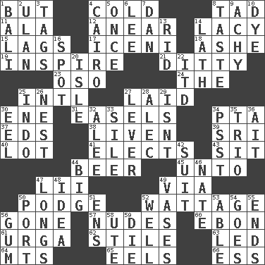 ACROSS 1. On the contrary 4. Having a low temperature 8. Bit 11. Insect wing 12. Approach 14. Made of lace 15. Falls behind 17. Ancient Celtic tribe of eastern Britain 18. American tennis player Robert 19. Heighten or intensify 21. Simple song 23. Bear (Spanish) 24. Definite Article 25. International (abbr.) 27. Put down 30. Compass dir. 31. Artist's stands 34. Parent Teacher Assoc. 37. Begley and Asner 38. Make or become more lively 39. _ Lanka 40. Car dealer's back yard 41. Chooses 43. Be seated 44. Fermented drink made from hops 45. To (old English) 47. Cards in a Roman deck? 49. By way of 50. Puddle 52. Electrical Measurement 56. Went 57. Unadorned figures 60. Inky black, to poets 61. Capital and largest city of Mongolia 62. Vertical member of a panel or frame 63. Directed 64. Mountains (abbr.) 65. Snakelike fish 66. Double-curved letter DOWN 1. Indonesian resort city 2. ____ Bator 3. Labels 4. Capital of Egypt 5. At one time in the past 6. Area sheltered from the wind 7. One of the 12 tribes of Israel 8. Clothes sense 9. Painful 10. Color 13. To free from 14. Thin strip of wood or metal 16. Blemish 20. Small island 22. It would 25. _ china 26. A home for chicks 27. Crowbar 28. Actor Baldwin 29. Is not 30. Snakelike fish 32. Toward shelter 33. Drop; flow; fall 34. Inconspicuous attention getter 35. Musical group of three 36. Small island 42. Set or collection 44. Massive 46. Nathan's nickname 47. Yearns 48. It may be bright or harebrained 49. Flower holders 50. Left side of a ship or aircraft 51. Followers of ems 52. Not ill 53. Competent 54. Moves 55. Conclusions 56. Chewing product 58. Shoshoni 59. Expire