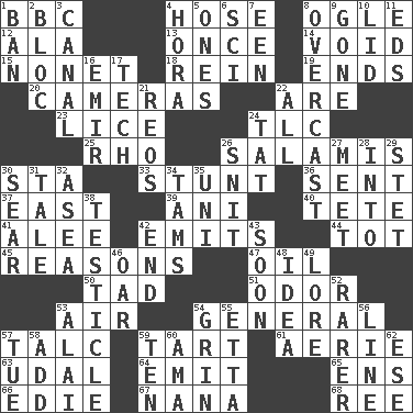 ACROSS 1. English channel? 4. Flexible conduit 8. Stare at amorously 12. Wing 13. Single time 14. Empty area or space 15. Music written for nine 18. It's straight from the horse's mouth 19. Conclusions 20. Devices for capturing images 22. "We ___ not amused" (Victoria) 23. Louse (plural) 24. Affectionate concern, for short 25. 17th letter of the Greek alphabet 26. Deli grouping 30. R.R. building 33. Difficult or unusual or dangerous feat 36. Posted 37. 90 degrees 39. Cuckoo 40. False hair 41. Toward shelter 42. Sends forth 44. Small child 45. Thinks logically 47. Petroleum 50. Bit 51. Scent 53. Wind 54. Commissioned military rank 57. Baby powder 59. Small pie 61. Nest on high 63. Freehold land 64. Give off 65. Followers of ems 66. Singer Brickell 67. Nanny 68. To riddle DOWN 1. Forbid 2. Alliance 3. Lessep's creation 4. Israeli folk dance 5. Singles 6. _-fi 7. Car or cant ending 8. Cloudy 9. Went 10. Flaplike covering 11. Begley and Asner 16. Independent ruler or chieftain 17. Technical 21. Vintage cars 22. Everything 24. Make lace 26. In a ____ (agitated or irritated) 27. Rendezvous 28. To the inside or interior of 29. Proofreading order 30. Burn superficially 31. Falsehood 32. At sea 34. Scottish caps 35. University (slang) 38. A testis 42. Conclusion 43. Within a short period 46. Rowing implement 48. The main thing one is thinking about 49. Old wives' tales, e.g. 52. More uncommon 53. Mountain range southwest of Kyrgyzstan 54. Smile widely 55. Singer James 56. Actor's bit 57. Third day of the wk. 58. Find the sum of 59. Nine, plus one 60. Nursemaid (var.) 62. Compass dir.