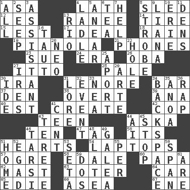 ACROSS 1. White ___ sheet 4. Thin strip of wood or metal 8. Downhill vehicle 12. French article 13. Indian princess (variant) 14. Become fatigued 15. For fear that 17. Standard of perfection 18. Water falling in drops from the sky 19. Player piano 21. Gives a jingle 23. Institute legal proceedings 24. Epoch 26. Chief or king in Benin or Nigeria 27. "Tell ____ the Marines!" 28. Diluted with white 30. Lyricist Gershwin 31. Poe poem 34. Drinking establishment 37. Lair 38. Unconcealed 39. Santa ___, CA 40. Eastern Standard Time (abbr.) 41. Cause to be 42. Police officer (slang) 43. Adolescent 44. "____ silly question..." 46. Nine, plus one 47. Label 50. It is 51. Centers 54. Portable computers 57. Legendary monster 58. Peak District village in England 60. Dad 62. Vertical spar for supporting sails 63. Carrier 64. Auto 65. Singer Brickell 66. At sea 67. Compass dir. DOWN 1. 100% 2. Ooze 3. Aide 4. Dipping utensil 5. Approach 6. Afternoon social gathering 7. Assist 8. Disco prop 9. Climbing, woody, usually tropical vines 10. One of the Great Lakes 11. Habitations of wild animals 13. River (Sp.) 16. Pulled tight 20. Modern: prefix 22. Opening into or through something 25. To the left, to Queeg 27. Angers 29. Johnson of "Laugh-In" 30. Binary compound 31. Old wives' tales, e.g. 32. Happening 33. Teachers' org. 34. Keyboard key 35. Small Philippine buffalo 36. Reproach for some lapse or misdeed 41. Penny 43. Cylindrical with tapered ends 44. Small island 45. Obstruct or block passage 46. Tarsus (plural) 48. Having winglike extensions 49. An organ shaped like a helmet 51. Dwelling 52. Mild oath 53. Bristle 55. For each 56. Connect, as a bridge 59. Two (Sp.) 61. "We ___ not amused" (Victoria)