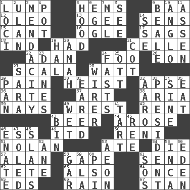 ACROSS 1. Mass 5. Cloth borders 9. Sound made by sheep 12. Margarine 13. Double curve, resembling the letter S 14. Elected reps. 15. Patter 16. Stare at amorously 17. Sinks 18. Indiana (abbr.) 19. Possessed 21. Cell (Danish) 22. First of billions? 24. Egg _ yung 26. Period of immesurable duration 27. Any of the three canals of the cochlea 28. Electrical Unit 29. Ache 30. Robbery 32. Domed church section 36. Johnson of "Laugh-In" 37. Nonscientific branch of learning 38. Operatic vocal solo 39. Negative votes 40. Obtain by seizing forcibly or violently 42. Monthly bill 43. Fermented drink made from hops 44. Came up 46. Double-curved letter 49. It would 50. Painter Guido (1575-1642) 51. Pitcher Ryan 53. Had dinner 54. Expire 57. Actor Alda or Thicke 58. Open wide 61. Post 62. False hair 63. In addition 64. At one time in the past 65. Begley and Asner 66. Precipitation 67. Comedian Laurel of Laurel & Hardy DOWN 1. Event scenes 2. ____ Bator, Mongolia 3. Ananias' fault 4. Plant holder 5. Parka part 6. Oval reproductive body of a fowl 7. Cartoonist voice _ Blanc 8. Observe 9. Calif. Air Force Base 10. White American of non-Hispanic descent 11. NE Netherlands city 14. Compass dir. 19. Actor Linden 20. Wet nurse 21. Small bed 23. Natives or inhabitants of Denmark 24. Goes without food and/or water 25. Baseball player Mel 27. "Two Mules for Sister ____" 28. One who wires 29. Baking dish 31. Having ears or earlike features 32. Composer Copland 33. Elected leader of a country 34. Trig term 35. Erode 40. Dripping 41. Small pie 43. Storage container 45. Portuguese money of account (variant) 46. Maternal 47. Having a sole or soles 48. Narrow boards 52. One (Scot) 53. Period of immesurable duration 55. South American Indian 56. Genesis locale 58. Slender fish 59. Wing 60. Air pressure measure (abbr.) 61. Mayday