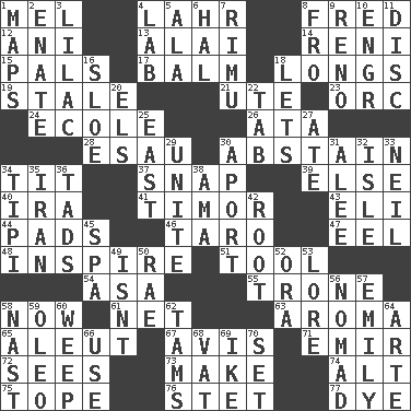 ACROSS 1. Cartoonist voice _ Blanc 4. Cowardly lion portrayer 8. Flintstone 12. Black tropical American cuckoo 13. Jai _ 14. Painter Guido (1575-1642) 15. Friends 17. Lip ointment 18. Yearns 19. Having lost freshness 21. Shoshoni 23. The grampus (Milton) 24. Learning spot: Fr. 26. _ moment's notice (2 wds.) 28. He sold his birthright 30. Refrain by choice 34. Teat (slang) 37. Fastener 39. Otherwise 40. Retirement account (abbr.) 41. The easternmost of the Lesser Sundas 43. Biblical high priest 44. Groovy apts. 46. Pacific island yam 47. Snakelike fish 48. Motivate 51. Implement 54. White ___ sheet 55. Heavy duty weighing machine 58. Immediately 61. Remaining after all deductions 63. Odor 65. Eskimo relative 67. Advice 71. Arab leader 72. Observes 73. Create 74. The first octave above the treble staff 75. Drink excessively 76. Proofreading order 77. Color DOWN 1. Atlas contents 2. Related on the mother's side 3. Pale purple color 4. Experiment locale 5. In the manner of 6. Actor Linden 7. Tall New Zealand timber tree 8. Away 9. Former U.S. Attorney General Janet 10. Engineer (abbr.) 11. Compact _ 16. _ gin 18. Allows 20. Raised railways 22. Bar bill 25. 90 degrees 27. Had dinner 29. Join together 30. To the left, to Queeg 31. Toward shelter 32. Small island 33. Famous astronaut Armstrong 34. Native american tent (variation) 35. SW Asia republic 36. Bits 38. Housemaid (var.) 42. Carrot, for example 45. Health resort 49. Is not 50. Actress Charlotte 52. Mouth or opening 53. Old wives' tales, e.g. 56. Wanderer 57. Poet Dickinson 58. Political cartoonist Thomas 59. Margarine 60. Shed a tear 62. Scottish caps 64. Johnson of "Laugh-In" 66. Purpose 68. Large container 69. Mamie's mate 70. Arrange properly for use