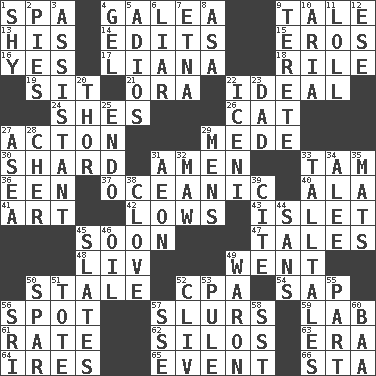 ACROSS 1. Health resort 4. An organ shaped like a helmet 9. Story 13. Part of HMS, perhaps 14. Prepares for publication 15. Greek god of love 16. Affirmative reply 17. Woody, climbing, usually tropical plant 18. Cause heat under the collar 19. Be seated 21. Mouth or opening 22. Perfect 24. "______ My Girl" (Turtles hit) 26. Domesticated feline 27. NE Massachussets city 29. Ancient Persian 30. Pottery fragment 31. So be it 33. Scottish cap 36. Car or cant ending 37. Pertaining to the sea 40. Wing 41. Tate display 42. Moos 43. Small island 45. Within a short period 47. Stories 48. 54 in ancient Rome 49. Gone 50. Showing deterioration from age 52. Numbers guy (abbr.) 54. Plant excrement 56. Specific locale 57. Plays smoothly or legato 59. Experiment locale 61. Assign a rank or rating to 62. Grain storage towers 63. Epoch 64. Angers 65. Incident 66. R.R. building DOWN 1. Like a shrinking violet 2. Sliced desserts 3. Helper 4. Set 5. Goodbye (Sp.) 6. One who doesn't tell the truth 7. Inactive volcano in Sicily 8. White ___ sheet 9. Cigar-shaped 10. Roberta Peters solo 11. Hang loosely or laxly 12. Compass dir. 20. Son of Odin 22. Ancient Celtic tribe of eastern Britain 23. June honoree 25. Inside; within (prefix) 27. Toward the sea 28. "Mermaids" star 29. Not women's 31. Period of immesurable duration 32. Opening into something insatiable 33. Baron Munchausen's specialties 34. Toward shelter 35. Floor coverings 38. Garlic unit 39. Quote 44. Without 45. Chalkboards 46. Lubricate 49. Make _____ (do battle with) 50. Coast Guard woman 51. Haul 52. 154 in Roman numerals 53. Whimper 55. Role in a play 56. _ Lanka 57. Compass dir. 58. Fast jet (abbr.) 60. Sound made by sheep