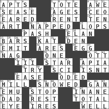 ACROSS 1. Tenement units (abbr.) 5. Carry 9. Deep reverence 12. Gospel singer Marvin 14. Grows older 15. Corporate head (abbr.) 16. Having ears or earlike features 17. Monthly bill 18. "___ Little Indians" 19. Nonscientific branch of learning 20. Slept 23. Chops off 24. Romantic infatuation 25. Style 27. Oblong pieces of solid material 30. Krazy ___ of comics 32. Lair 33. Give off 34. Ancient Greek god of war 36. Oval reproductive body of a fowl 38. Tired old horse 39. Single 40. Baseball player Mel 43. One more than two 46. Play the lead 48. Capital of Western Samoa 49. Attempt 51. _-fi 52. Is not 53. Comfort 54. Wrote a lyric poem 56. Place where flour is made 58. Overwhelmed 61. Separate the seeds from cotton 64. Australian flightless bird 65. Obstruct or block passage 66. Empty; void 68. Male parent 69. Respite 70. Add up to 71. Sight organ 72. Angers 73. Not ill DOWN 1. At sea 2. Lightbulb-shaped fruit 3. Small pie 4. Compass dir. 5. Canvas cover 6. Double curve, resembling the letter S 7. Looked after 8. Eastern Standard Time (abbr.) 9. 13-14th century defensive garment 10. Shed a tear 11. Immeasurably long periods of time 13. Pulitzer Prize-winning author Ferber 21. "____ silly question..." 22. N Egypt peninsula 23. Long (Scottish) 24. Pacific Standard Time (abbr.) 26. Area sheltered from the wind 27. Benjamin's nick name 28. Wet nurse (var.) 29. Swiss mountan, "Queen of the Mountains" 31. Portable shelters 35. Manatee 37. Republicans 41. Shallow baking pan 42. Make lace 44. Slanted text style (abbr.) 45. Big collection agency 47. Travel on or in a vehicle 48. Assist 50. Of or pertaining to yesterday 53. Dodge 55. Prepare for publication 56. Ancient Persian 57. "If ____ say so..." 59. Characteristic smell of wine 60. Elects 61. Yard entry 62. Of or related to the anus 63. 1994 drama film starring Jodie Foster 65. Indian title of respect (Mr.) 67. Immediately