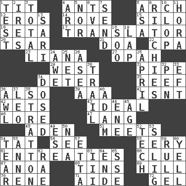 ACROSS 1. Teat (slang) 4. Pismires 8. Bowlike part 12. Greek god of love 14. Be footloose 15. Grain storage tower 16. Stalk of a moss capsule 17. Interpreter 20. Russian ruler of old 21. ___ good deed 22. Numbers guy (abbr.) 23. Woody, climbing, usually tropical plant 27. Brightly colored fish 29. 270 degrees 31. Corncob 34. Prevent from occurring 35. Coral ridge 36. In addition 39. Auto club (abbr.) 41. Is not 42. Soaks 43. Perfect 46. Old wives' tales, e.g. 47. Long (Scottish) 48. Arabian gulf 51. Confronts 54. Make lace 56. Observe 58. Suggestive of the supernatural 61. Pleas 66. A slight indication 67. Small Philippine buffalo 68. Metal containers 69. Land elevation 70. French philosopher Descartes 71. Helper 72. Set DOWN 1. Trial 2. Angers 3. "_____ Recall" 4. Tate display 5. And not 6. Federal power corp. 7. Post 8. White ___ sheet 9. Actors Guy, Robert Welles, and Clint 10. Hoof sound 11. Israeli folk dance 13. Indian skirt 18. "Barney Miller" actor Jack 19. Infant locale 24. Deep reverence 25. Remaining after all deductions 26. Toward the sea 28. Showery time 30. Go after with the intent to catch 32. Fenced enclosure 33. Bank Draft (abbr.) 34. Administered medicine 36. Leather borer 37. Lion 38. Ski resort town in Vermont 40. First man 44. Compass dir. 45. Personal question 49. Compass dir. 50. Teachers' org. 52. Georgia ____ (Atlanta school) 53. Major League Baseball Commissioner Bud 54. Rend 55. Singer Murray 57. Singer James 59. Court order 60. Shout 62. Actress Charlotte 63. One more than two 64. Conclusion 65. Compass dir.