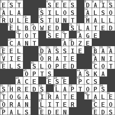 ACROSS 1. Eastern Standard Time (abbr.) 4. Observes 8. Raised platform 12. Chicken ___ king 13. Grain storage towers 14. In addition 15. Governing power 17. Difficult or unusual or dangerous feat 18. Promenade 19. Turned at an angle; bent 21. Scheduled 23. Small child 24. Put into a specified state 26. Personal question 27. Patter 28. Edge tool used to cut and shape wood 30. Snakelike fish 31. Hyrax 34. Sound made by sheep 37. Compete 38. Speak pompously 39. Cuckoo 40. Raised railways 41. Slanted 42. Small bed 43. Elects 44. "____ silly question..." 46. Adept person 47. Compass dir. 50. Personal Computers (abbr.) 51. Tears up 54. Portable computers 57. Ancient Roman robe 58. Feeling or showing extreme anger 60. Story 62. NW Algerian seaport 63. 61 cubic inches 64. Corporate head (abbr.) 65. Friends 66. Paradise 67. Begley and Asner DOWN 1. Ewer handle 2. Change direction abruptly 3. Baron Munchausen's specialties 4. Locates 5. Dodge 6. A really long time 7. Fast planes 8. Break 9. Having winglike extensions 10. Capri or Wight 11. Disposed of to a purchaser 13. Compass dir. 16. Inky black, to poets 20. Baseball player Mel 22. Goldbrick 25. Clothes sense 27. To provide with a ceiling 29. Passed on 30. First lady 31. Stupid person 32. Came up 33. Plant excrement 34. Keyboard key 35. Small Philippine buffalo 36. Small island 41. Hurried 43. Seas 44. Fitting 45. Highlander 46. Therefore, facetiously 48. Schedule 49. Eroded 51. Constrict 52. Israeli folk dance 53. Filth; sediment 55. For each 56. Downhill vehicle 59. To free from 61. Greek goddess of the dawn