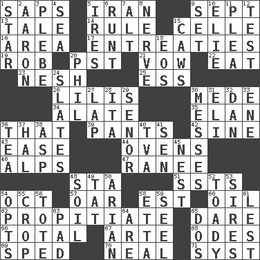 ACROSS 1. Plant excrements 5. SW Asia republic 9. Back-to-school mo. 13. Falsehood 14. Court order 15. Cell (Danish) 16. Length times width 17. Pleas 19. Director Reiner 20. Pacific Standard Time (abbr.) 21. Solemn pledge 22. Consume 23. Delicate 25. Double-curved letter 26. Ms. Damita and namesakes 30. Ancient Persian 34. Having winglike extensions 35. Style 36. Not this but _ 39. Leg coverings 42. Trig term 43. Relaxation 44. Baking chambers 46. High mountains 47. The wife of a rajah (variant) 48. R.R. building 51. Fast planes 54. Sep. follower 57. Boat paddle 58. Eastern Standard Time (abbr.) 60. Petroleum 62. Appease 65. Have the gumption 66. "_____ Recall" 67. Johnson of "Laugh-In" 68. Lyric poems 69. Moved rapidly 70. Be tempered by heat 71. System (abbr.) DOWN 1. Play the lead 2. Composer Copland 3. Cadet 4. Ocean 5. Angers 6. Undersized animal 7. The first octave above the treble staff 8. Impudent aggressiveness 9. Arrange properly for use 10. Writer Wiesel 11. Entreaty 12. Trial 15. Crow sounds 18. Greek goddess of the dawn 20. Silvers or Donahue 24. Chalkboards 27. Pet locale 28. Call ___ day 29. Sir (Sp.) 30. Makes clutter 31. Connecticut Ivy Leaguer 32. One of the 12 tribes of Israel 33. Compass dir. 36. Afternoon social gathering 37. Actor Linden 38. Viper 40. Federal power corp. 41. Elected rep. 45. Egg locale 48. The visible part of the earth's surface 49. Make lace 50. Believer in; advocate of (suffix) 52. Sycophant 53. Begets 54. Chooses 55. Riding implement 56. Carryall 58. Singer James 59. Sew up the eyelids of hawks and falcons 61. For fear that 63. Writing tablet 64. "We ___ not amused" (Victoria) 65. Two (Sp.)