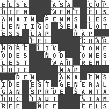 ACROSS 1. Otherwise 5. White ___ sheet 8. Police officer (slang) 11. South Vietnam president (1954) 12. Gone 14. Raised railways 15. With great haste 17. Actor Sean's family 18. French article 19. Small, flat, pigmented spot on the skin 21. Ocean 22. Car dealer's back yard 23. Curvy letter 24. Pet locale 25. Strike 27. Snakelike fish 28. Burn to charcoal 31. Greater amount 35. 54 in ancient Rome 37. Heavy book 38. Lyric poems 39. Dreamland 41. Washington bills 42. For fear that 43. Armed conflict 45. Monthly bill 46. Singer Brickell 47. Atlas unit 49. Lair 51. Alias (abbr.) 52. Followers of ems 55. Binary compound 57. Eastern Standard Time (abbr.) 60. Commissioned military rank 62. Separate the seeds from cotton 63. Upset 65. Before Barbara or Clara 66. The grampus (Milton) 67. Tense 68. Thailand, formerly 69. Portuguese money of account (variant) 70. Born 71. Snakelike fish DOWN 1. Peak District village in England 2. Citrus fruits 3. Actors Connery and Penn 4. Send forth 5. Deep reverence 6. Elected reps. 7. Singer Murray 8. Portable communications device 9. Butter sub 10. Inconspicuous attention getter 13. Russian ruler of old 16. "Death on the ____" 17. Cotton for raincoats, e.g. 20. Highlander 26. Thespian 29. So be it 30. Take ten 31. Undercover agent 32. Wrote a lyric poem 33. Dwelling 34. First name in cosmetics 36. Promise 40. Break 44. Immoral or dissolute person 48. Baking dishes 50. A home for chicks 52. Bert's buddy 53. Relating to or accompanying birth 54. Hits or strikes with great force 55. Russian composer Stravinsky 56. Have the gumption 58. Connect, as a bridge 59. Loyal 61. Relaxation 64. Shoshoni