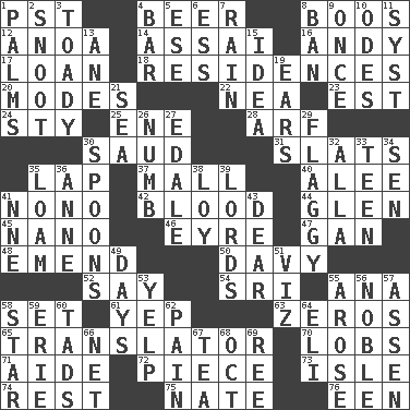 ACROSS 1. Pacific Standard Time (abbr.) 4. Fermented drink made from hops 8. Scornful sounds 12. Small Philippine buffalo 14. Slender Brazilian palm 16. "60 Minutes" Commentator Rooney 17. Grant temporary use of 18. Dwellings 20. Methods 22. Teachers' org. 23. Eastern Standard Time (abbr.) 24. Filthy place 25. Compass dir. 28. Sandy's bark 30. Saudi Arabian king (1953-1964) 31. Narrow boards 35. Infant locale 37. Shopping center 40. Toward shelter 41. Words to Nanette 42. Vital fluid 44. Small, secluded valley 45. Billionth: prefix 46. Jane of fiction 47. Separate the seeds from cotton 48. Make improvements or corrections to 50. _ Jones' Locker 52. Declare 54. _ Lanka 55. Santa ___, CA 58. Arrange properly for use 61. Slangy assent 63. Nothings 65. Interpreter 70. Tennis shots 71. Helper 72. Component 73. Capri or Wight 74. Repose 75. Nathan's nickname 76. Car or cant ending DOWN 1. Insides of hands 2. Snout, nose 3. Sycophant 4. Soap unit 5. Compass dir. 6. Curvy letter 7. Precipitation 8. Forbid 9. At one time in the past 10. Lyric poems 11. System (abbr.) 13. A saturated hydrocarbon 15. The main thing one is thinking about 19. Hearing organs 21. Ocean 26. Unfeeling 27. Peak District village in England 29. Tasteless 30. Soup utensils 32. Silent film actress Nazimova 33. Adolescent 34. Elected rep. 35. Rich soil 36. Singer Murray 38. Myrna of the movies 39. Titled peers of a realm 41. Compass dir. 43. Letter starter 49. 24-hour periods 51. To wit 53. Sharp bark 55. Came up 56. Having high moral qualities 57. NE Netherlands city 58. Play the lead 59. 4th largest of the Great Lakes 60. Small boys 62. Ache 64. Biblical high priest 66. Fish or hair follower 67. Beverage made from leaves 68. Sep. follower 69. Portuguese money of account (variant)